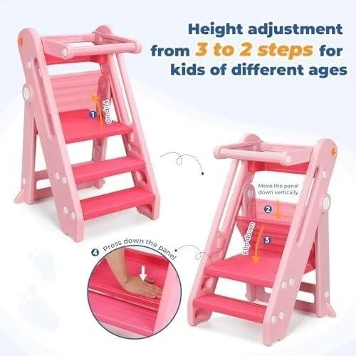 Adjustable kids step stool. This learning tower is great for little ones. Height adjusts from 3 to 2 steps, works for different ages. Helps kids reach the counter for cooking or sink for brushing teeth. Also good for getting toys off shelves.