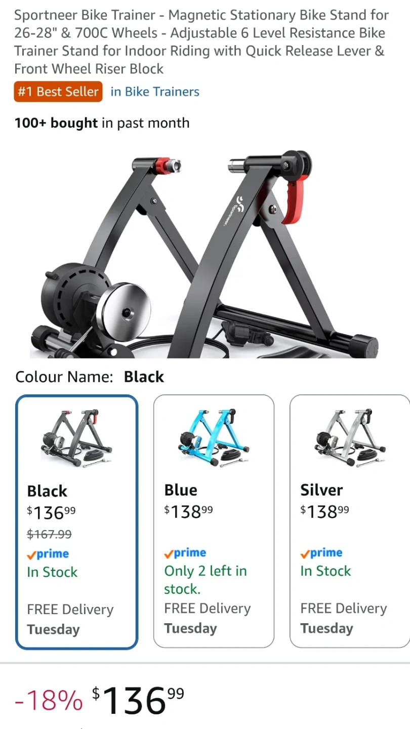 Sportneer magnetic bike trainer for indoor riding. It comes with a front wheel riser block and adjustable resistance. Great for 26-28" and 700C wheels. This trainer's magnetic resistance allows for a smooth workout experience indoors.