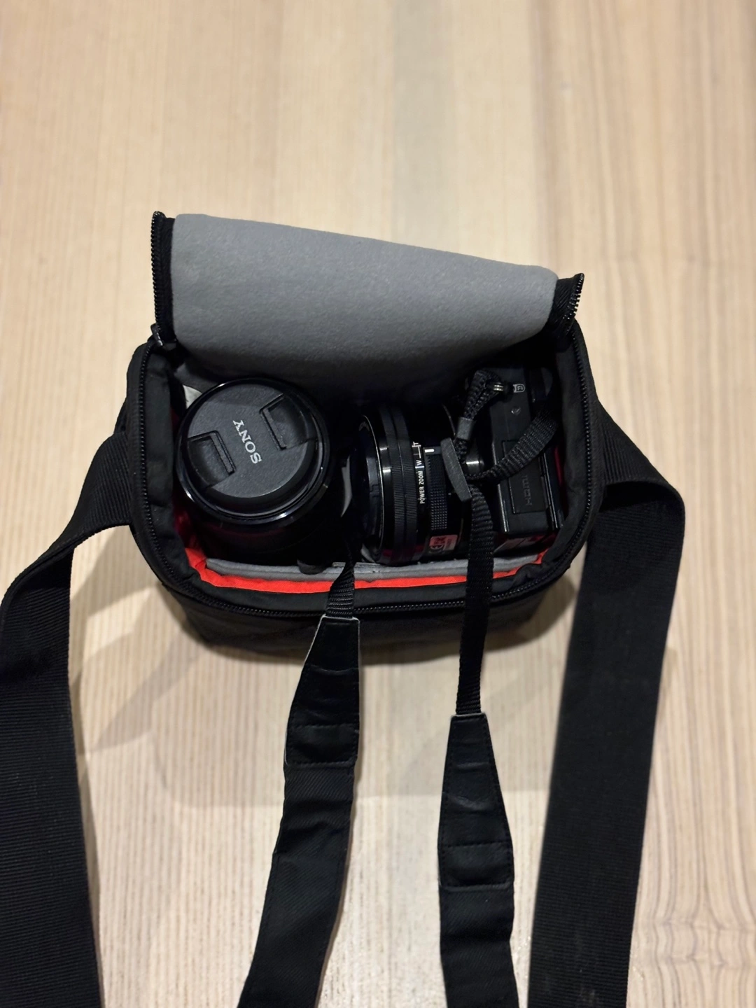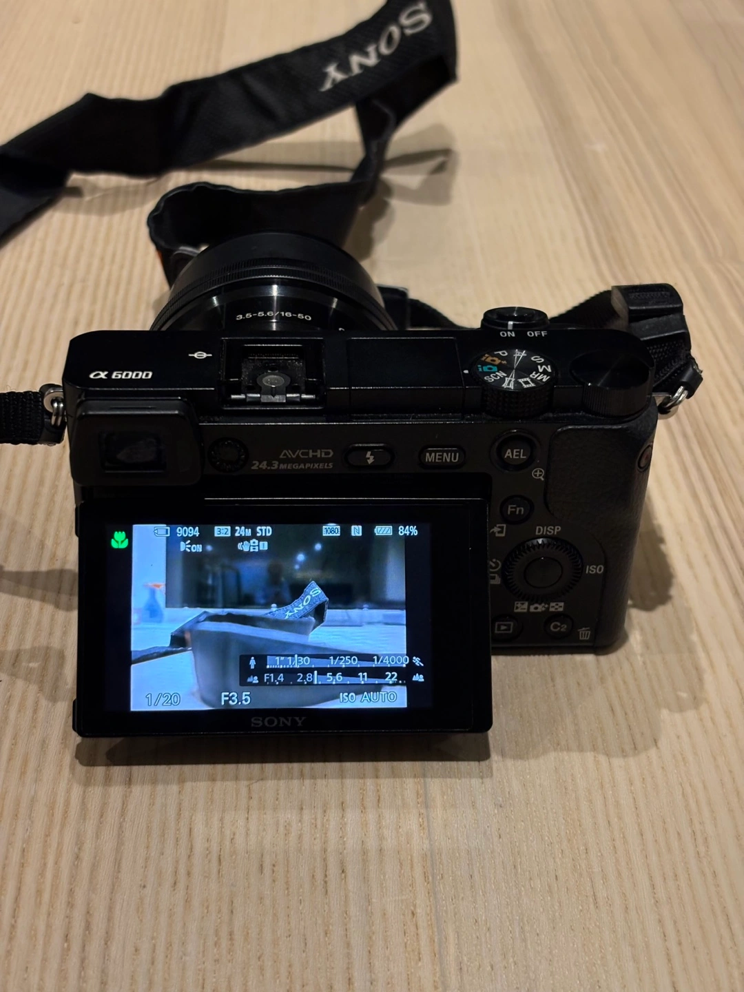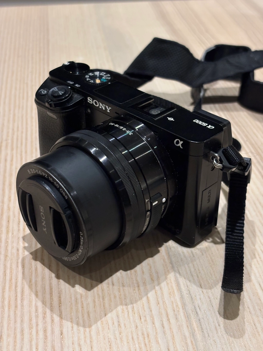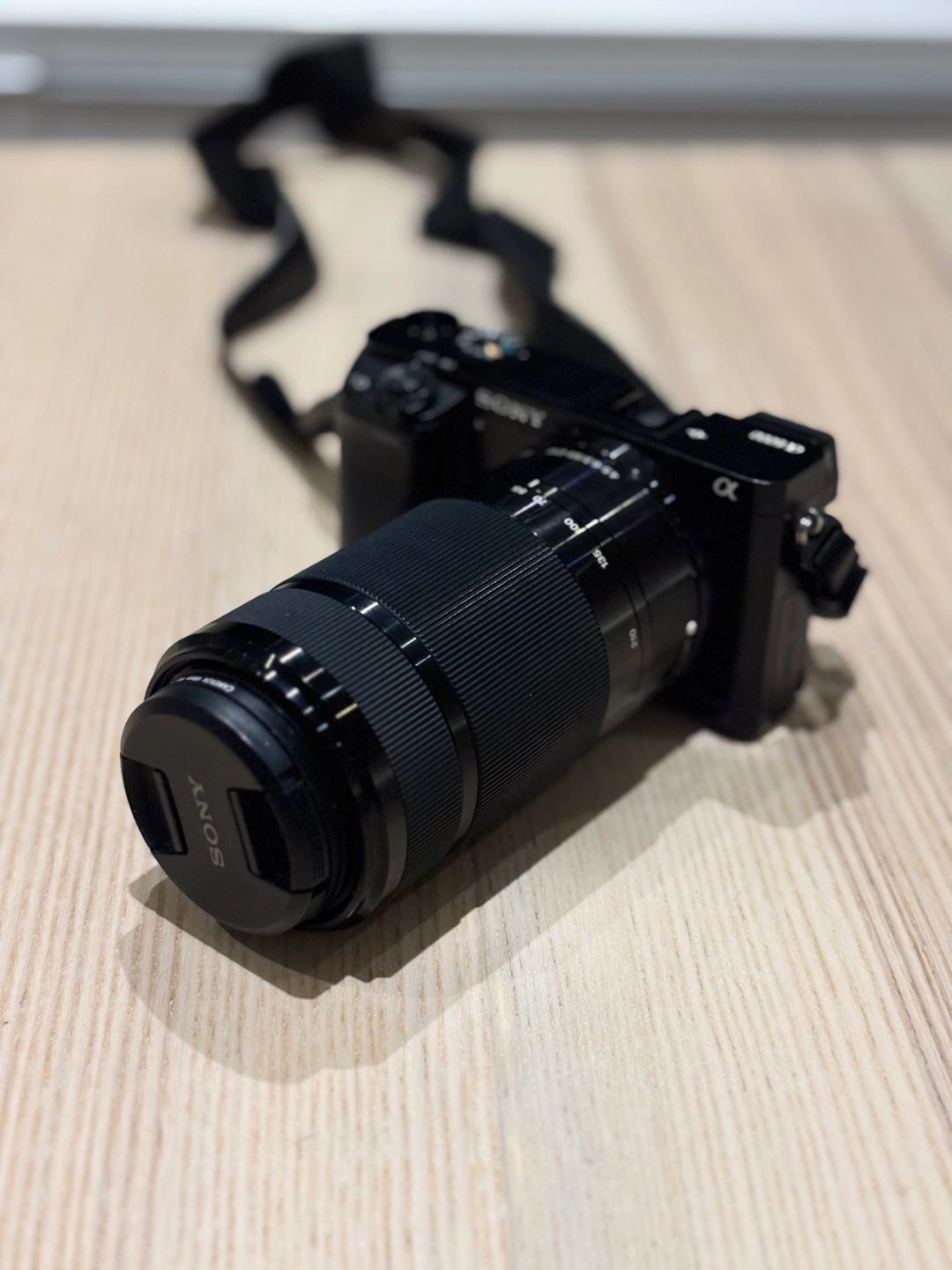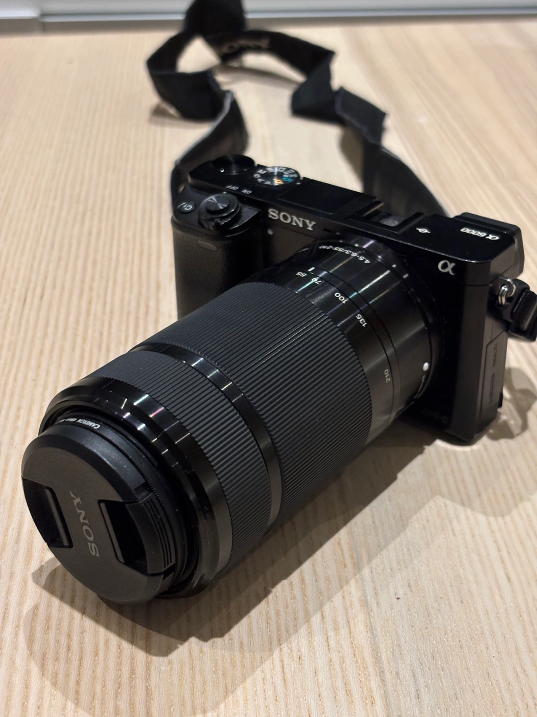 Sony Alpha 6000 mirrorless camera. Includes a 55-210mm telephoto lens. Black camera with a black strap. Excellent condition. Bag included.