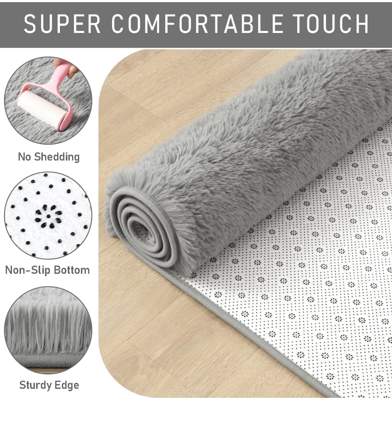 Super comfortable touch fluffy area rug. It's grey and features a non-slip bottom for safety. Sturdy edge construction ensures durability.