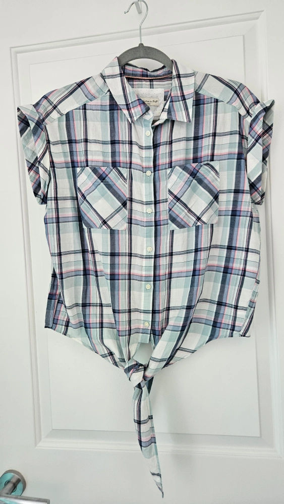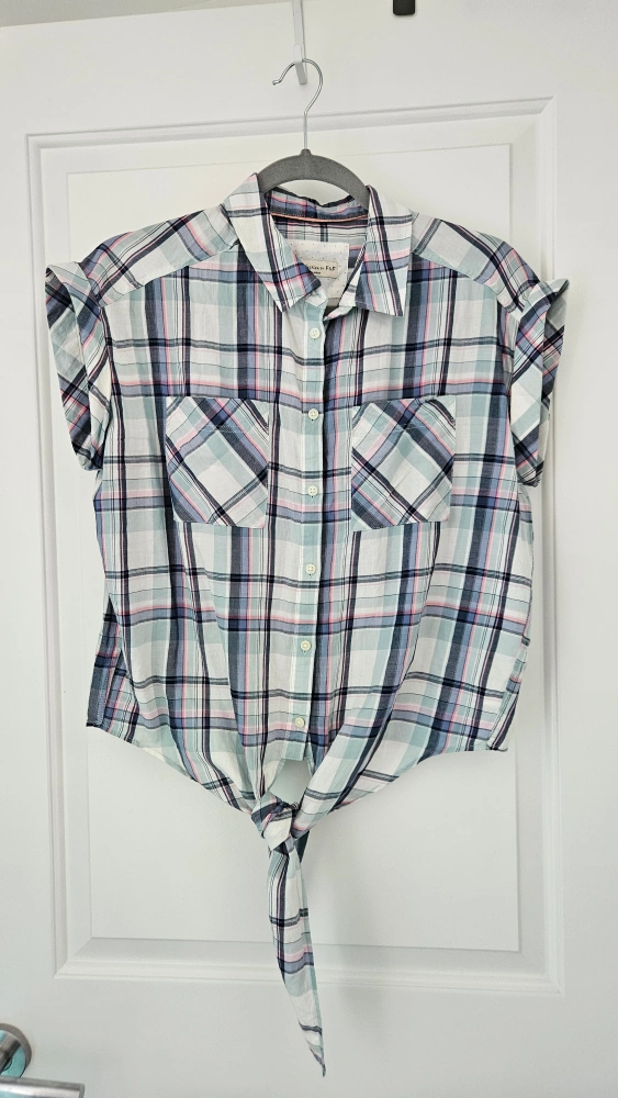 Cute plaid shirt from F&F's Casual Collection! Size is US 6- Medium (UK Size 10). It features a tie-front design and short sleeves, perfect for warmer weather. In great condition and ready for a new home!