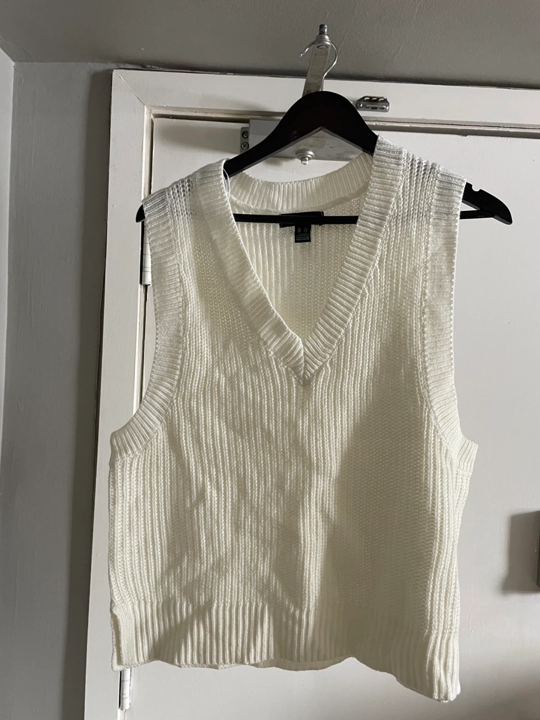 A classic white knitted sweater vest. It has a V-neck and a ribbed hem. This vest is a versatile layering piece. Pick up only. Cash only.