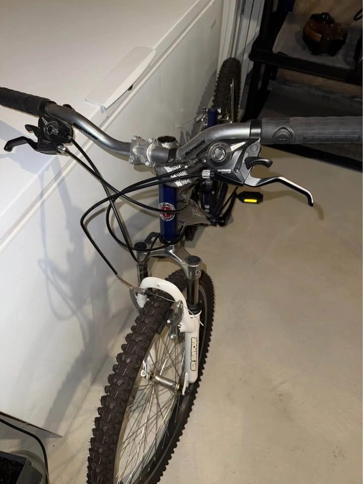 Selling a blue Schwinn Suspend mountain bike. Great frame for someone who likes to refurbish bikes or needs high-quality parts. Missing Seat: You will need to provide your own seat and post. Tires are currently flat; unsure if they just need air or if the tubes need replacing. Has some light surface rust (see photos), but the frame is solid. Equipped with a 21-speed Shimano drivetrain and SR Suntour front suspension forks. Being sold AS-IS. Perfect for a summer project or for parts.