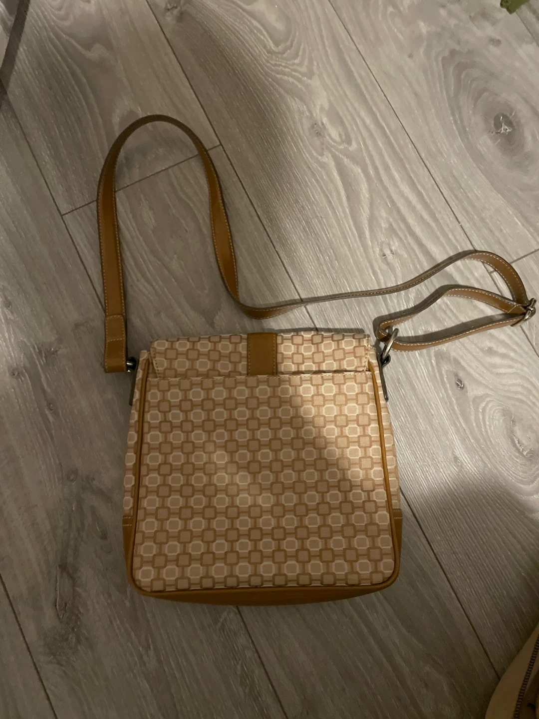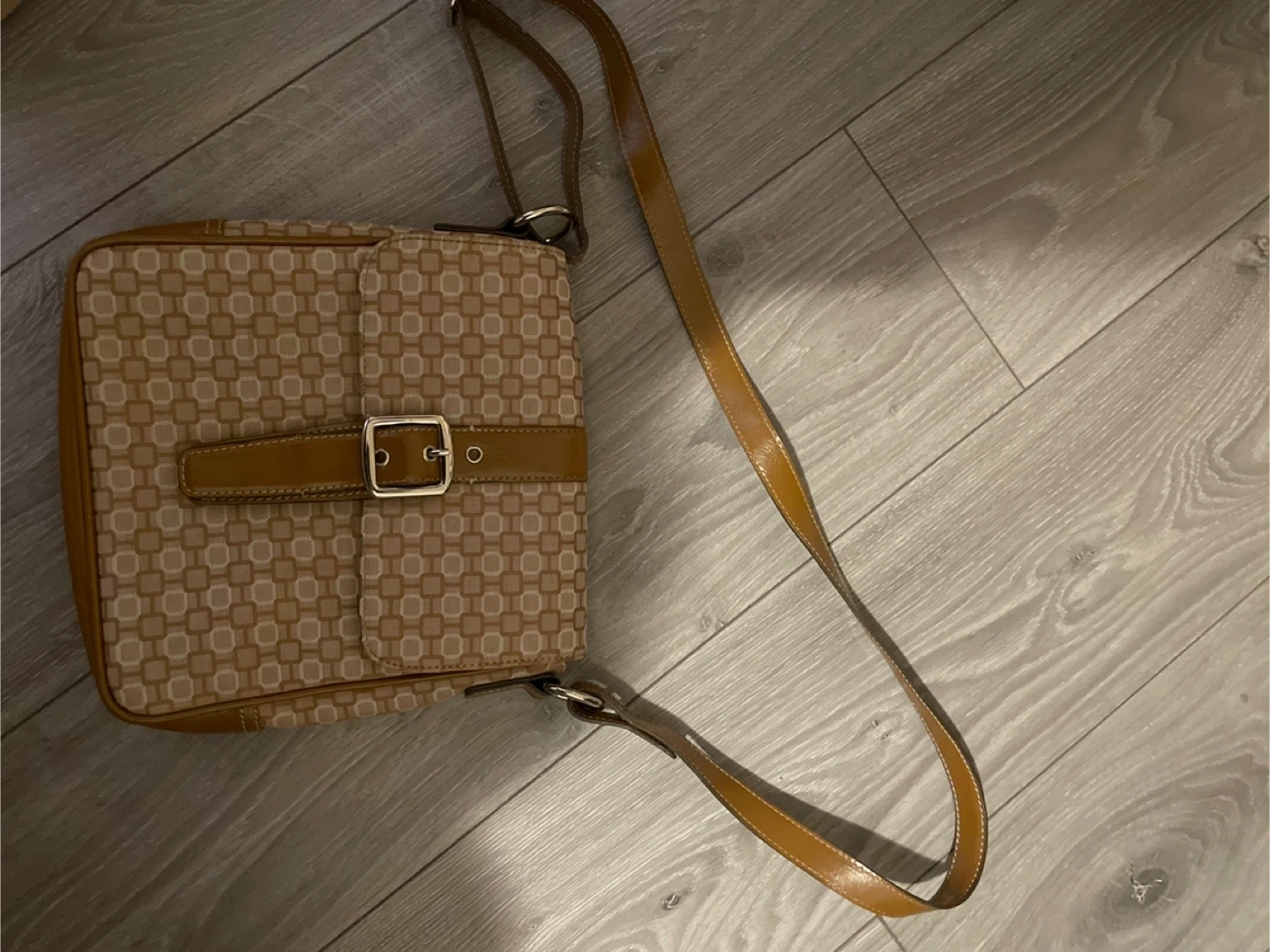 This Nine West shoulder bag features a brown and tan patterned exterior with faux leather trim. It's made with 55% cotton and 45% polyester. The strap is adjustable.