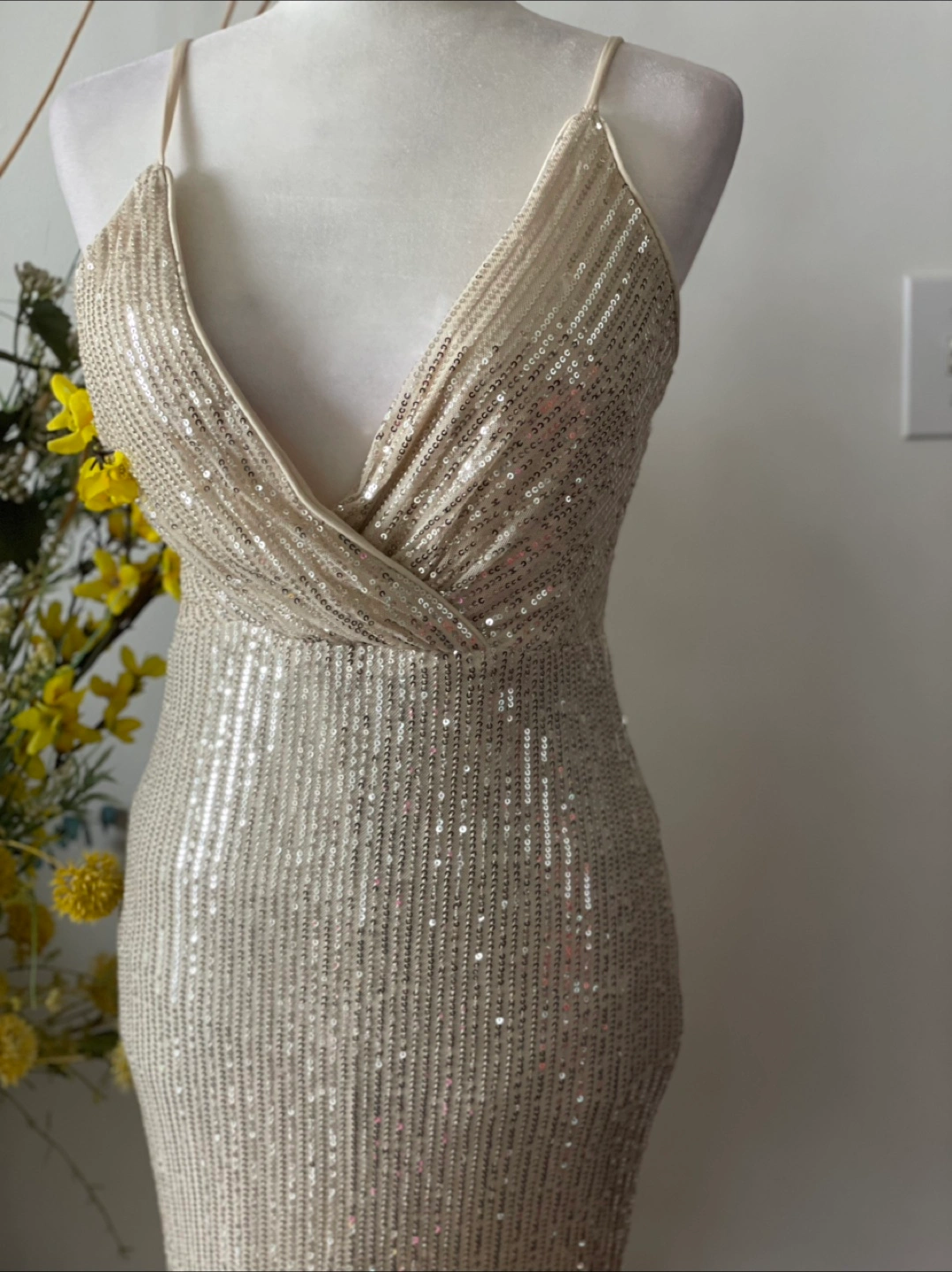 Beautiful sequin evening gown, perfect for a special occasion! It has a flattering silhouette and a stylish slit detail