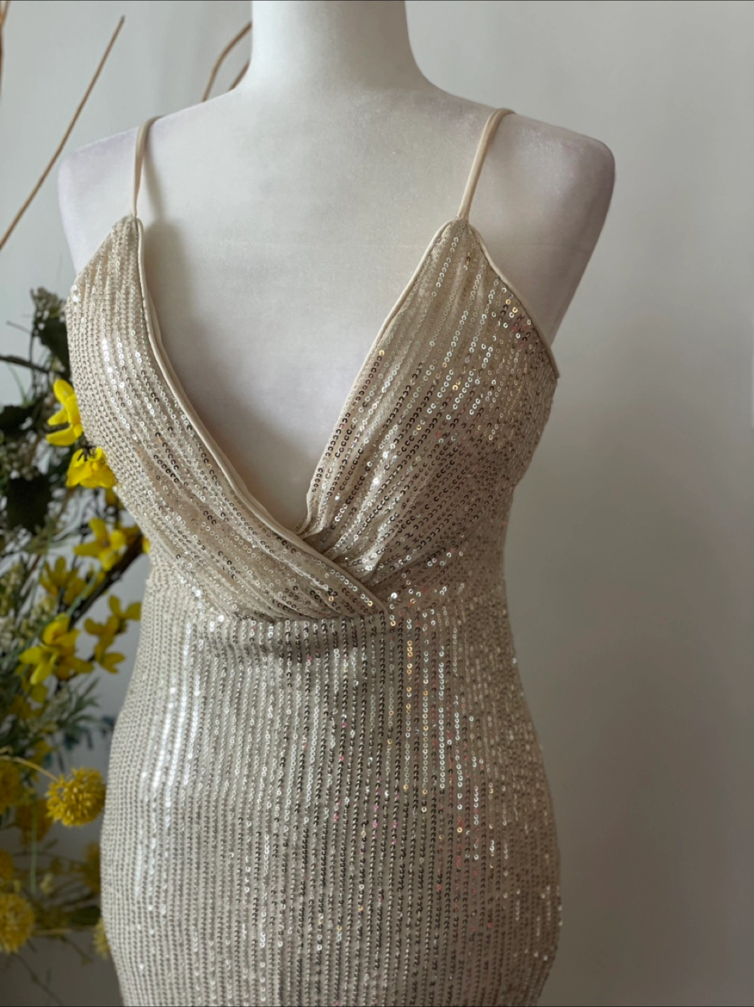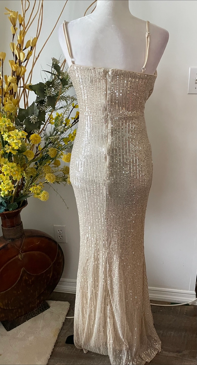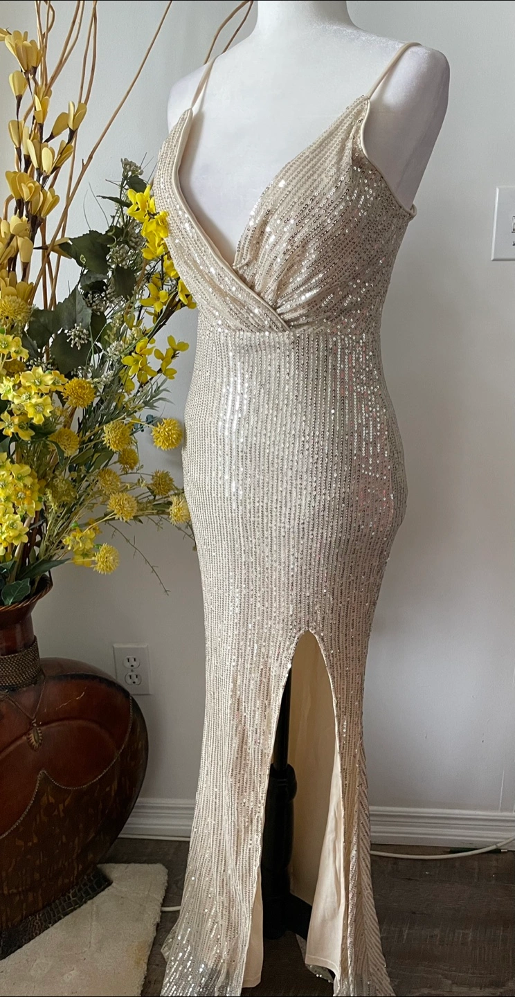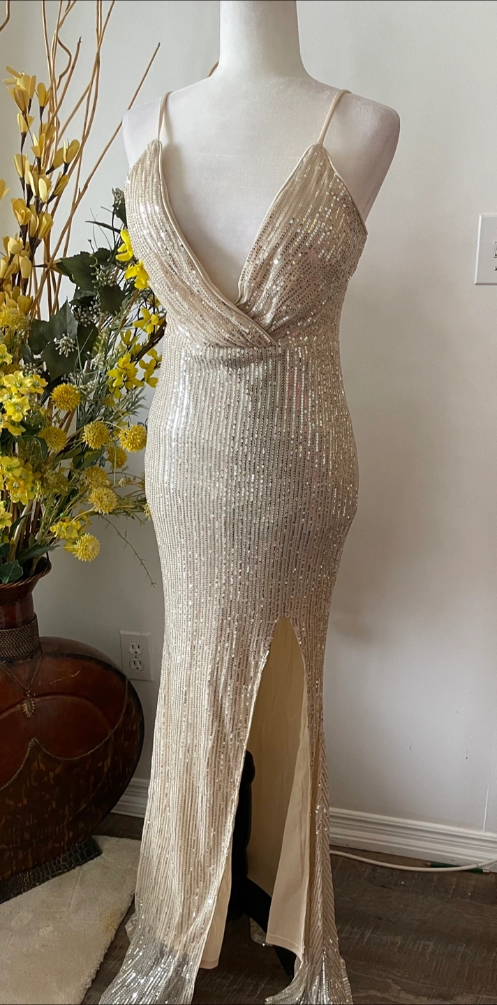Beautiful sequin evening gown, perfect for a special occasion! It has a flattering silhouette and a stylish slit detail