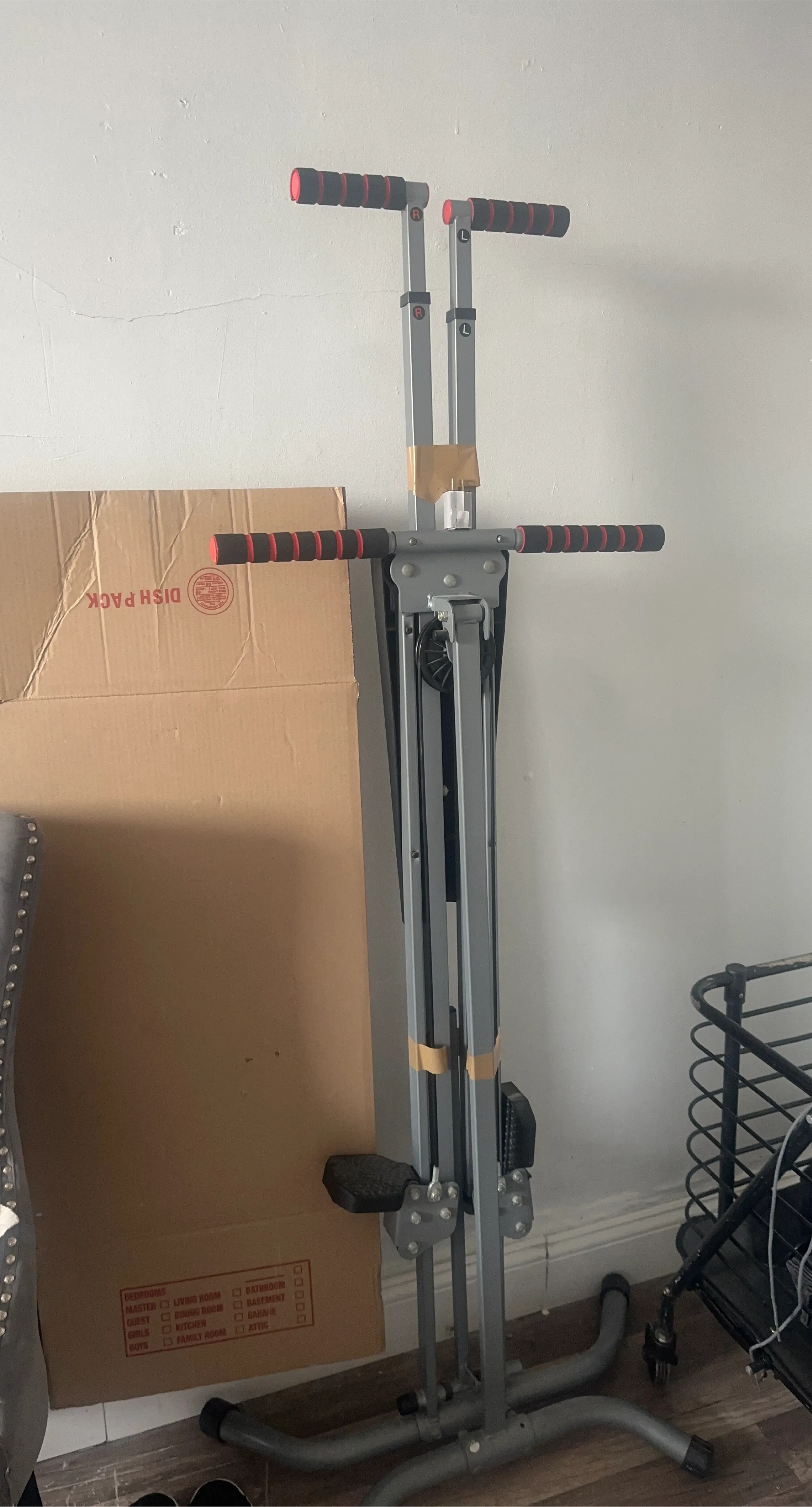 This vertical climber exercise machine offers a full-body workout. It's constructed with a durable gray metal frame. The handles feature red and black grips for comfort.