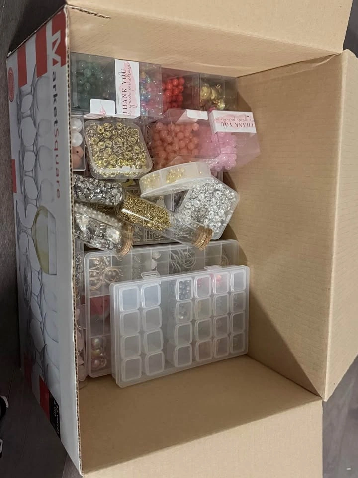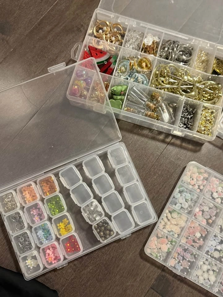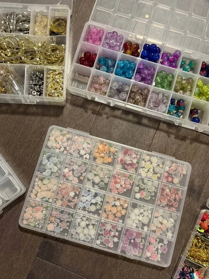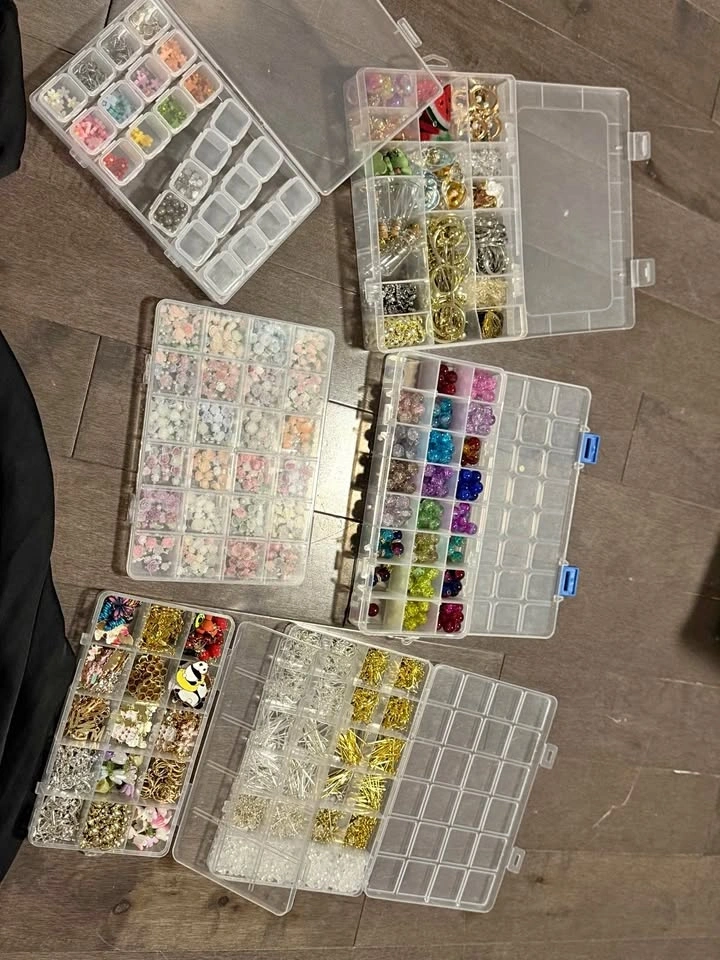 Selling a large, organized bundle of jewelry-making and craft supplies ✨ Includes: Multiple storage organizers (filled), Gold & silver findings (hooks, pins, rings, connectors), Decorative charms & embellishments, Variety of beads (glass, pearl, acrylic, colorful), Mini glass bottles & accessories, Resin/decor pieces. Perfect for starting a small business, Etsy shop, or DIY projects. Asking $170 or best offer.