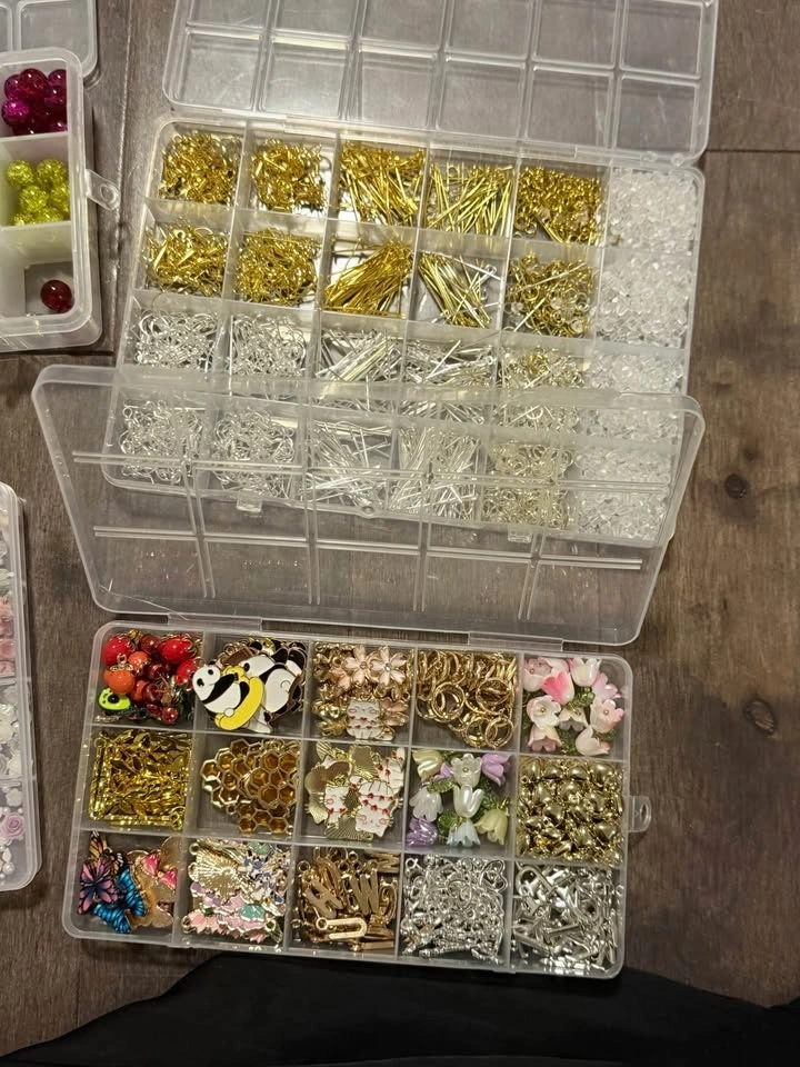 Selling a large, organized bundle of jewelry-making and craft supplies ✨ Includes: Multiple storage organizers (filled), Gold & silver findings (hooks, pins, rings, connectors), Decorative charms & embellishments, Variety of beads (glass, pearl, acrylic, colorful), Mini glass bottles & accessories, Resin/decor pieces. Perfect for starting a small business, Etsy shop, or DIY projects. Asking $170 or best offer.