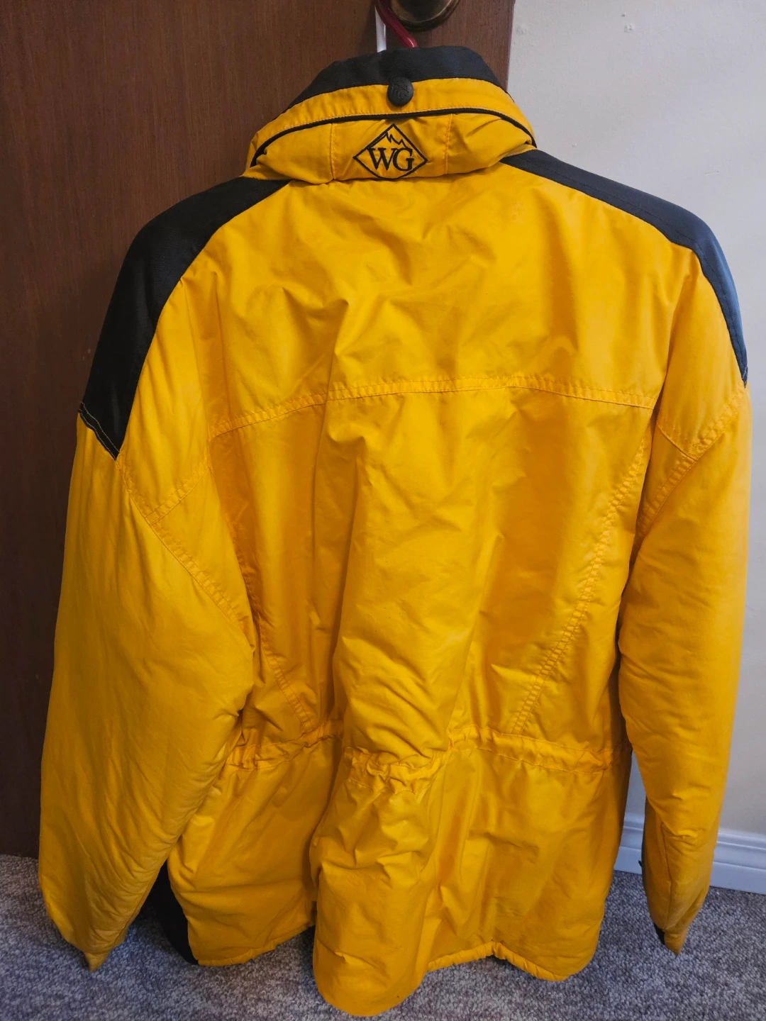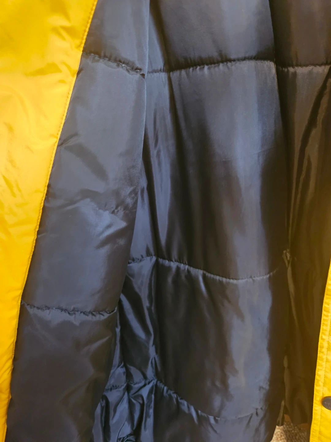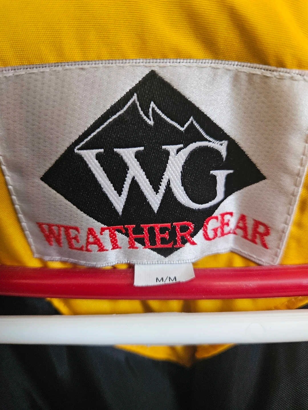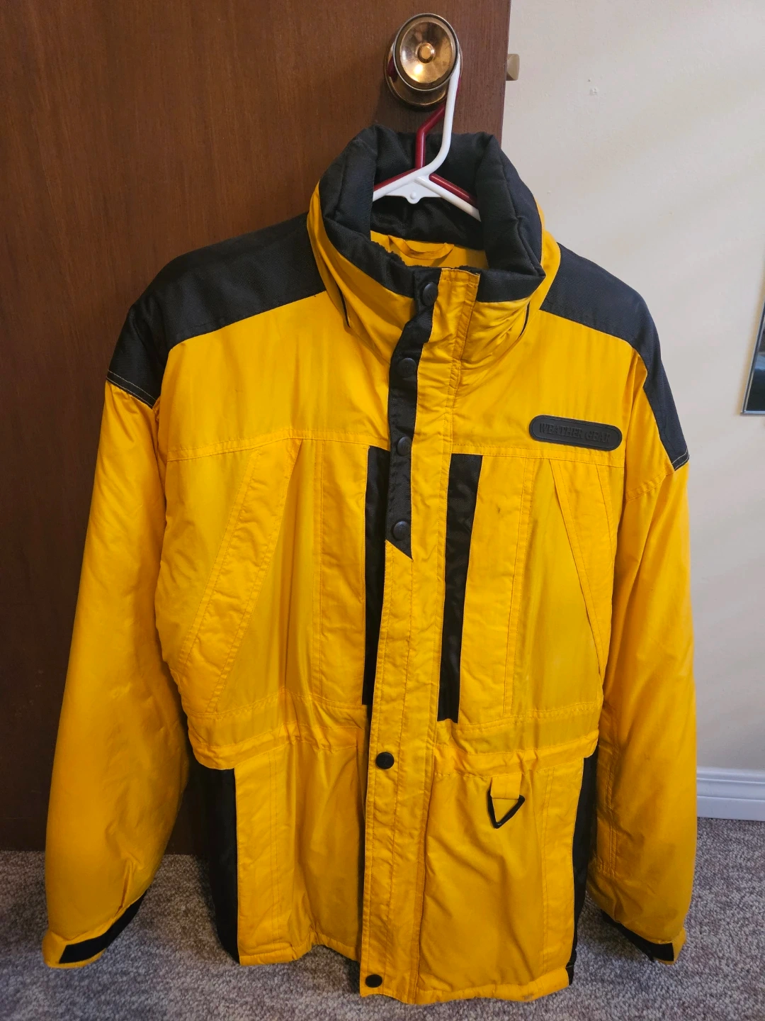 Yellow and black Weather Gear puffer jacket. It's a medium/medium size. Lined with black, quilted material for warmth. Hood neatly tucked inside collar with zipper and snap closing options.