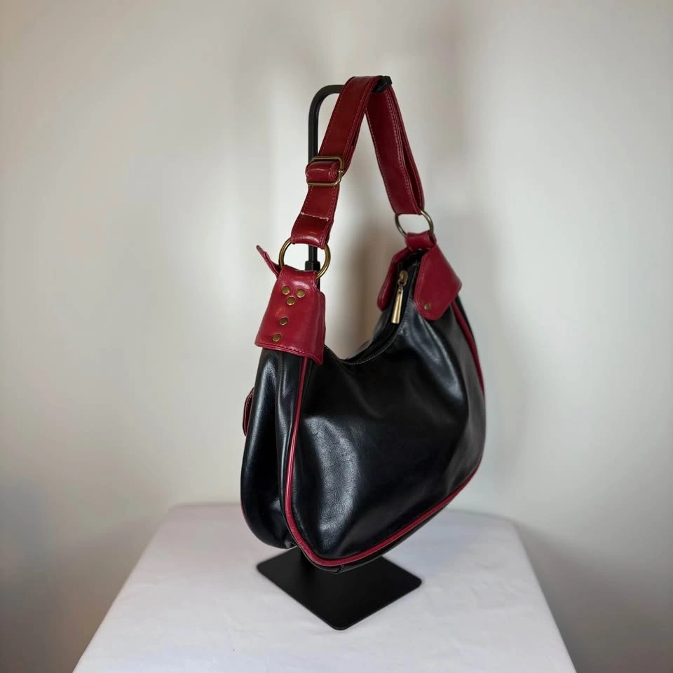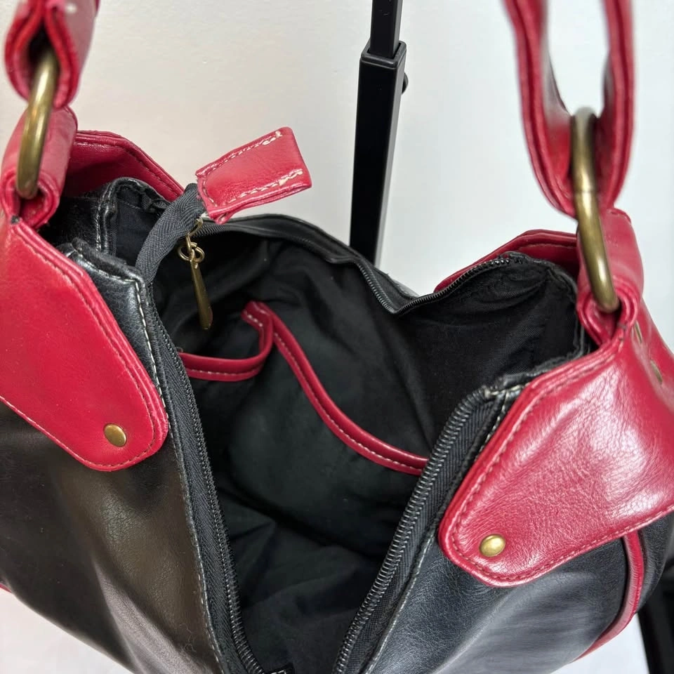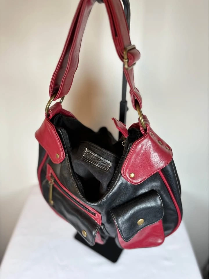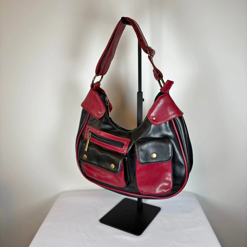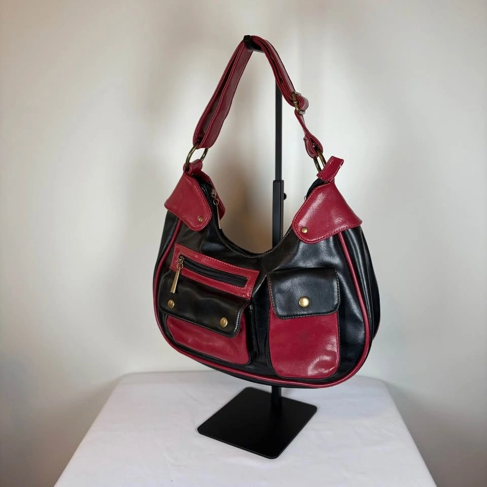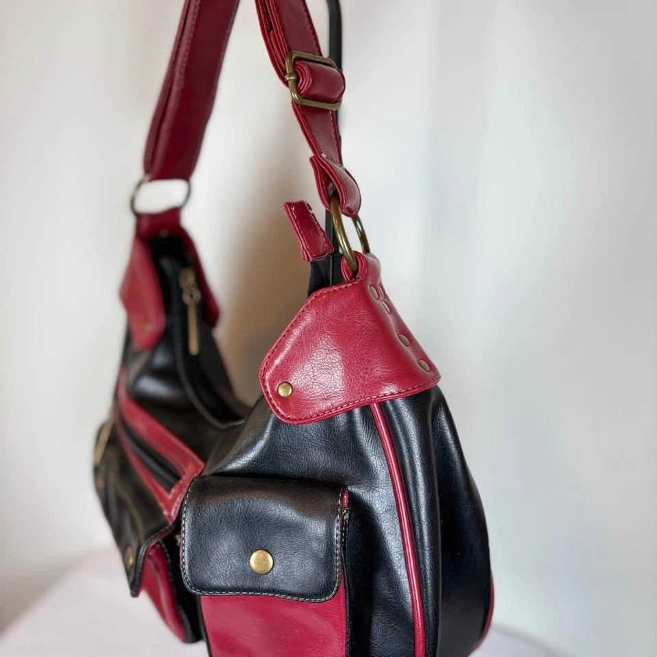 Pick up in Bolton, ON. Black and red faux leather shoulder bag with gold-tone hardware. Adjustable shoulder strap and top zip closure. Exterior features multiple pockets including two flap pockets and a front zip pocket. Interior includes one zip pocket and two slip pockets for easy organization. Approx. measurements: length 14”, width/depth 4”, height 5.5”, strap drop adjustable 10”–20”. Gently used with light general wear consistent with normal use. Hardware and overall structure remain in good shape. Great eye-catching Y2K style shoulder bag with lots of pockets and adjustable strap.