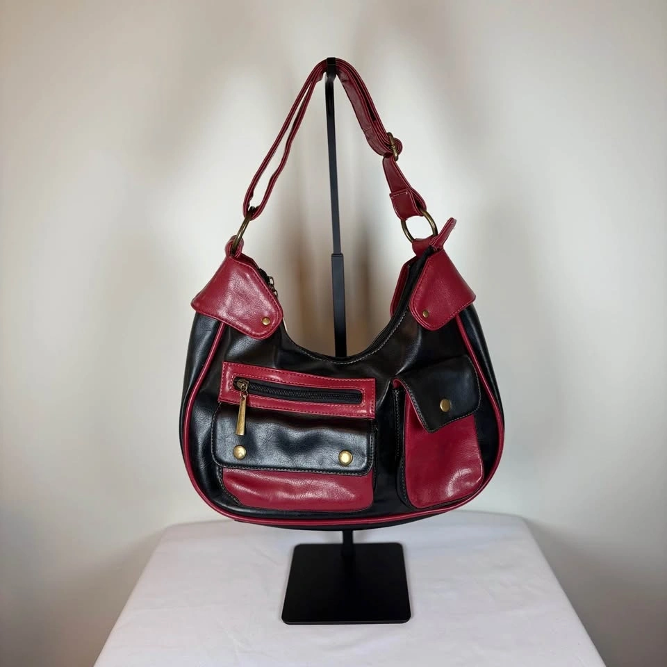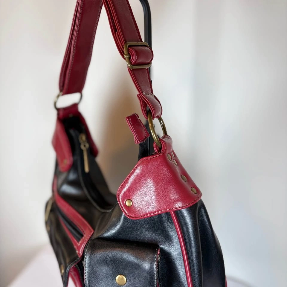 Pick up in Bolton, ON. Black and red faux leather shoulder bag with gold-tone hardware. Adjustable shoulder strap and top zip closure. Exterior features multiple pockets including two flap pockets and a front zip pocket. Interior includes one zip pocket and two slip pockets for easy organization. Approx. measurements: length 14”, width/depth 4”, height 5.5”, strap drop adjustable 10”–20”. Gently used with light general wear consistent with normal use. Hardware and overall structure remain in good shape. Great eye-catching Y2K style shoulder bag with lots of pockets and adjustable strap.