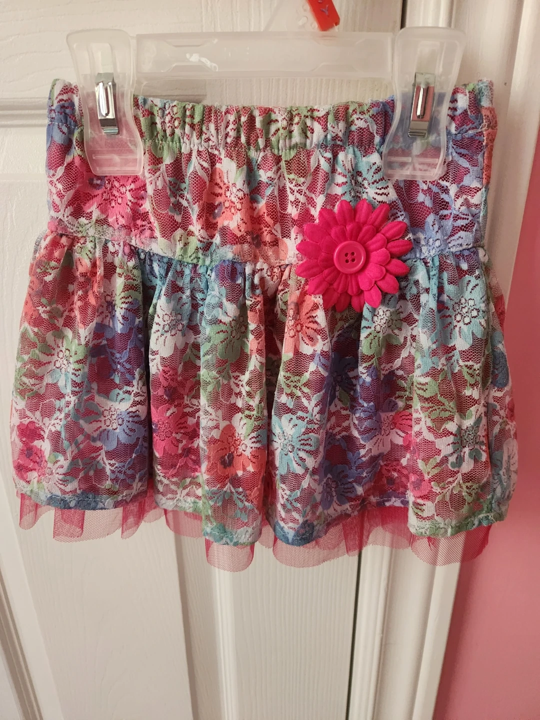 Cute floral print skirt with a pink flower applique and button detail. Features a comfortable elastic waistband and a pink tulle trim. Perfect for little ones to wear for a special occasion or everyday play!