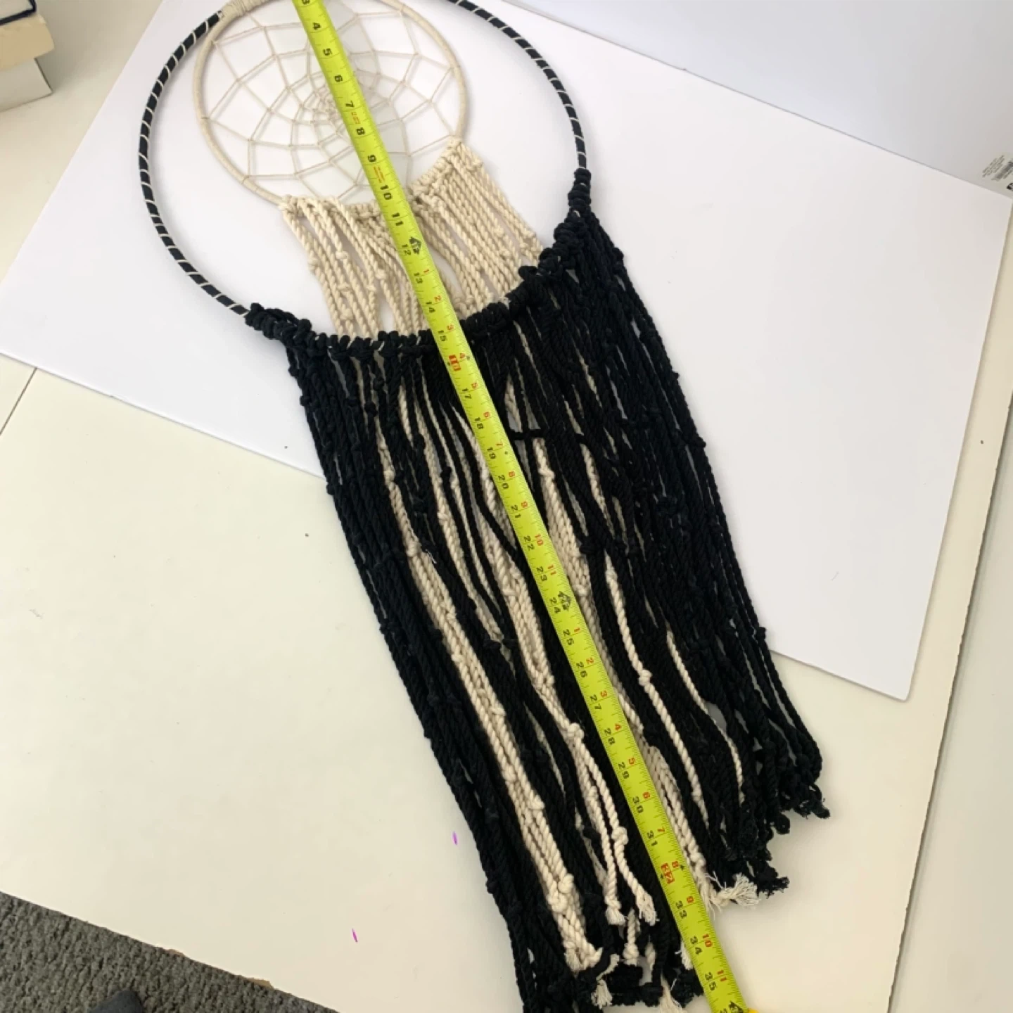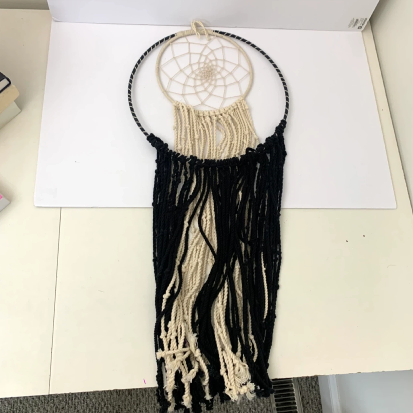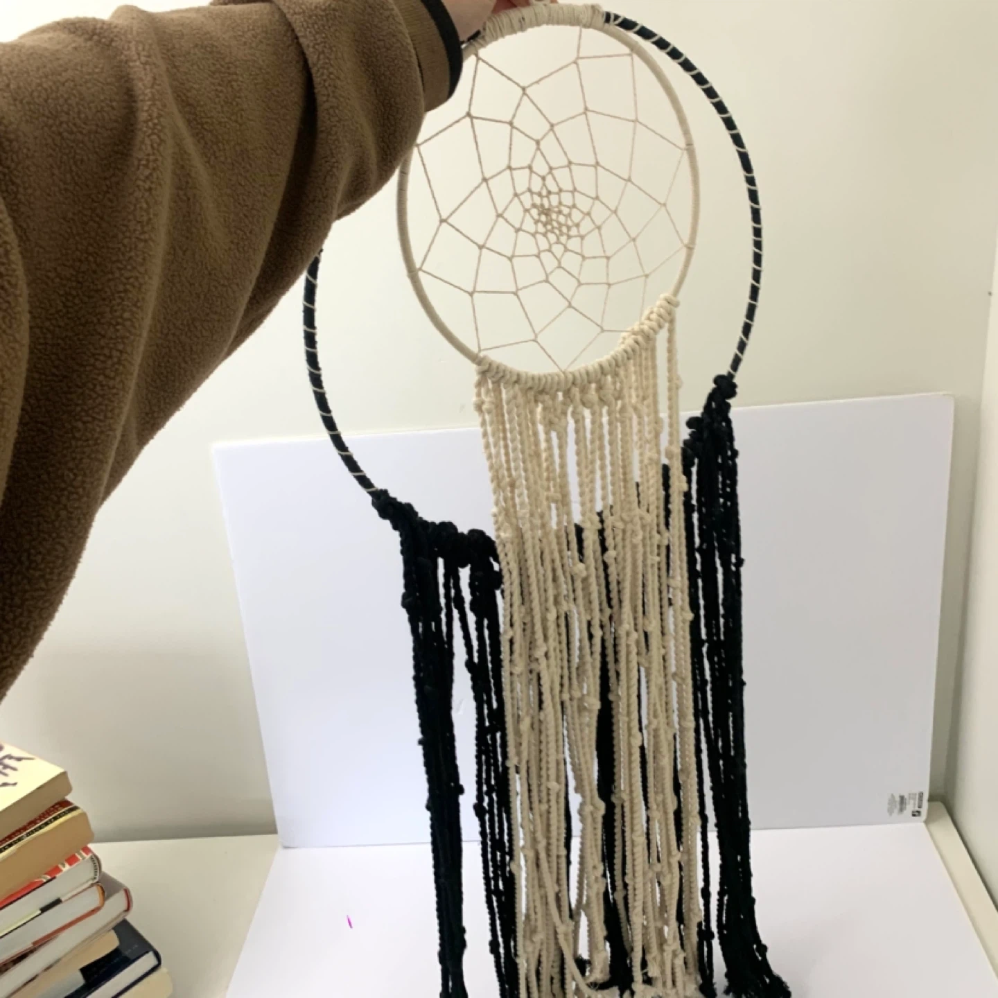 Macrame dream catcher wall hanging large boho decor perfect for bedroom, living room, or nursery. Black and cream rope design with large outer hoop and smaller inner dream catcher adds a stylish boho touch while creating a warm decorative feel in any space.