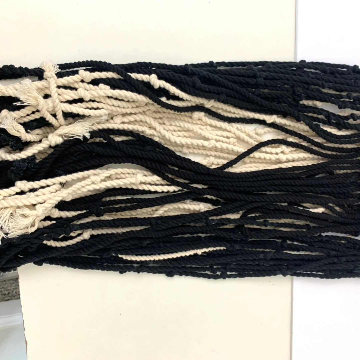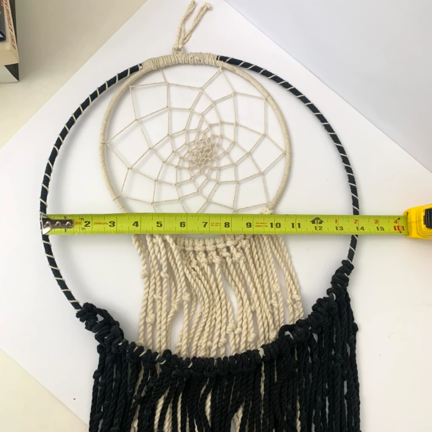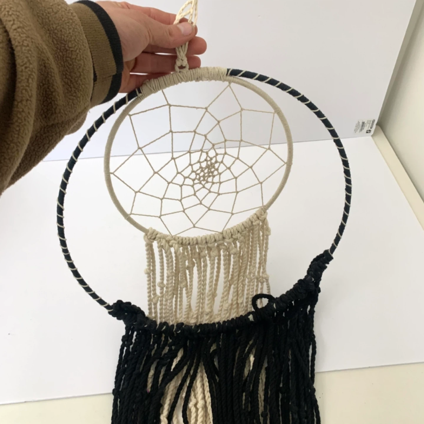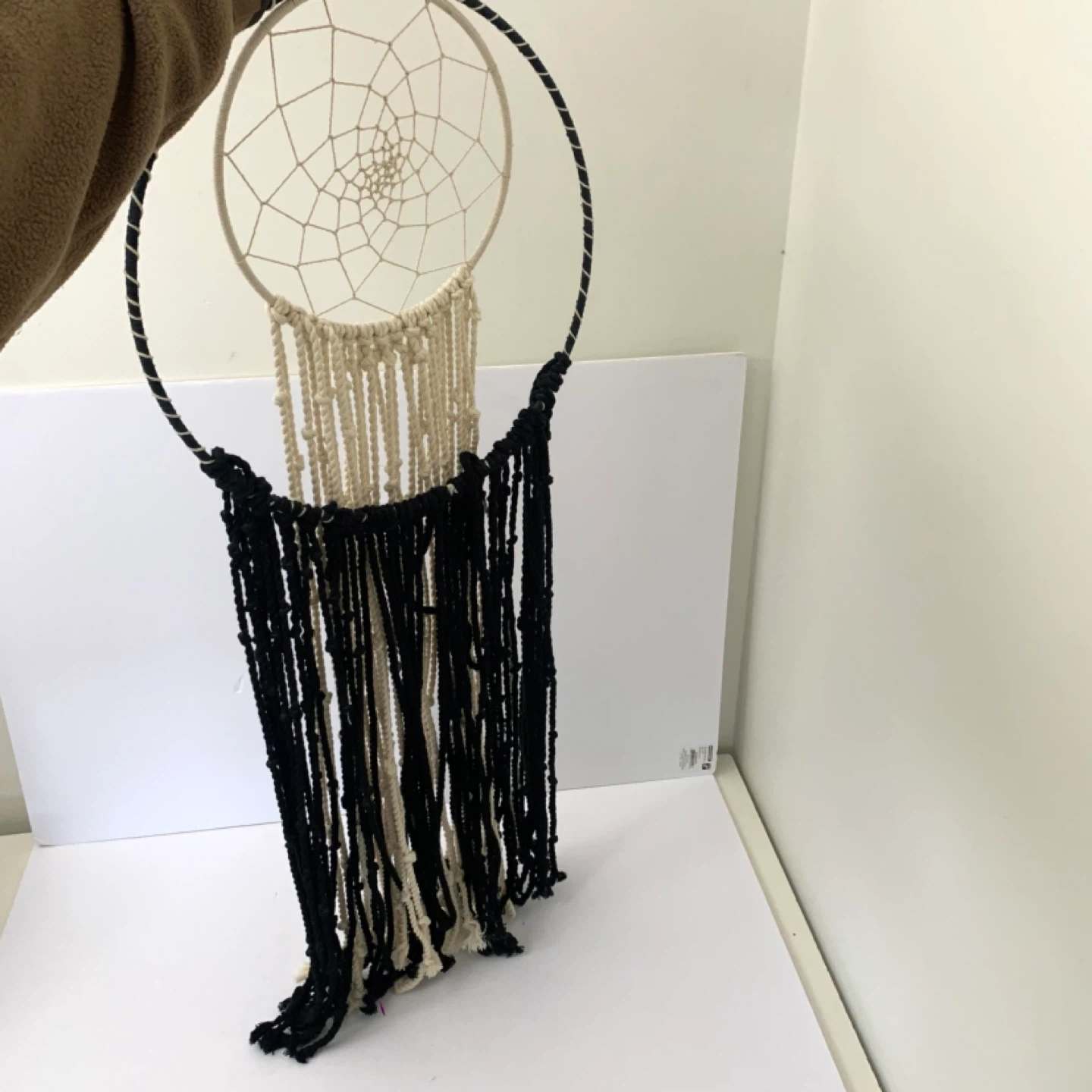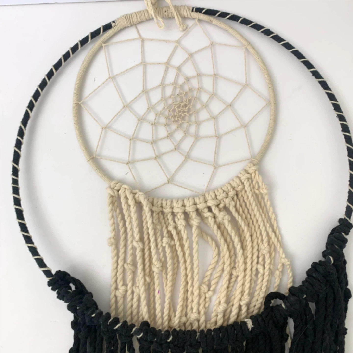 Macrame dream catcher wall hanging large boho decor perfect for bedroom, living room, or nursery. Black and cream rope design with large outer hoop and smaller inner dream catcher adds a stylish boho touch while creating a warm decorative feel in any space.