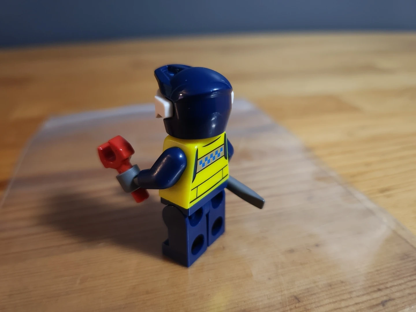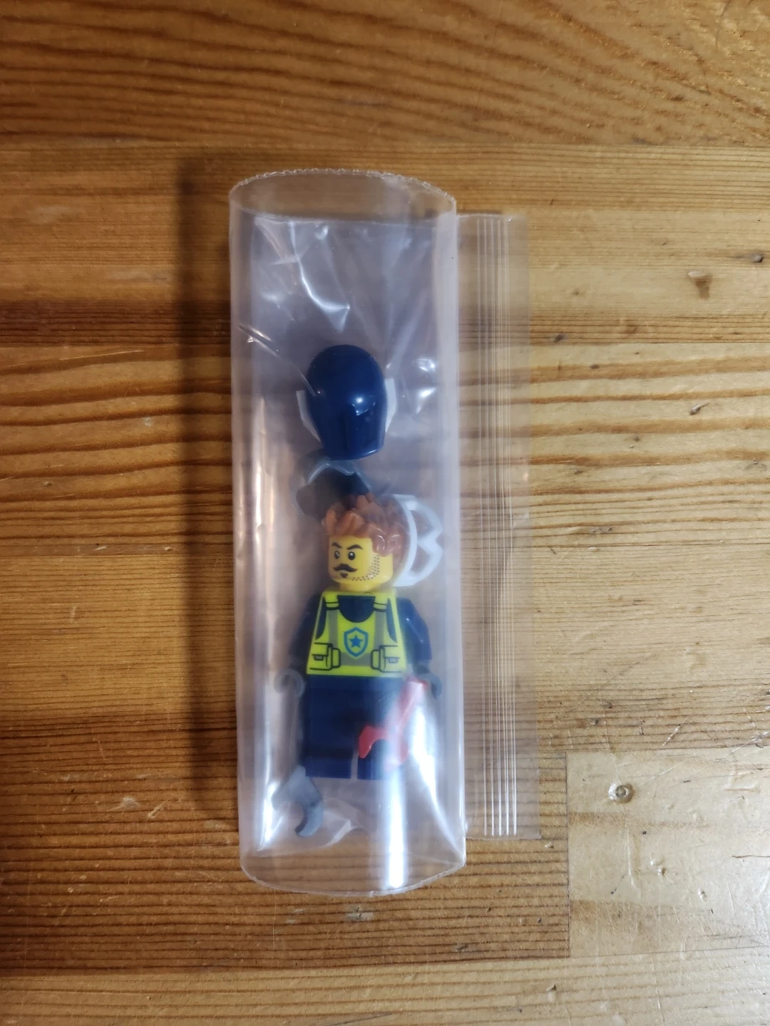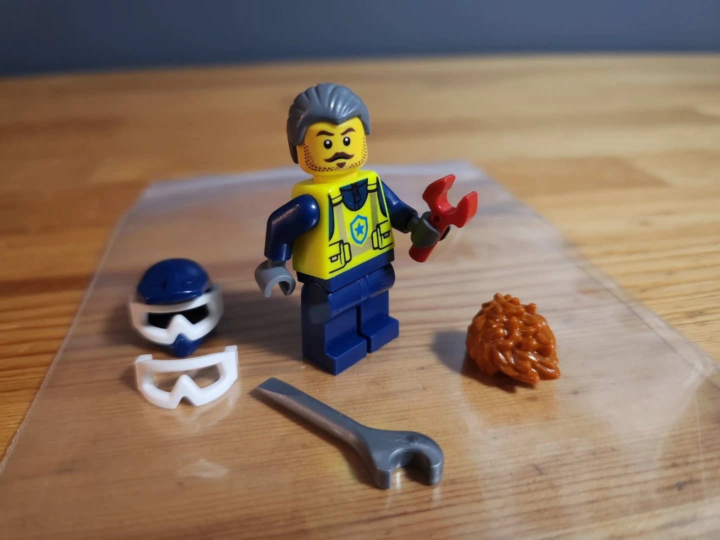 This LEGO minifigure dressed as a mechanic comes with several accessories including a helmet, goggles, a wrench, and a red tool. The figure has a yellow vest with blue sleeves and dark blue pants.