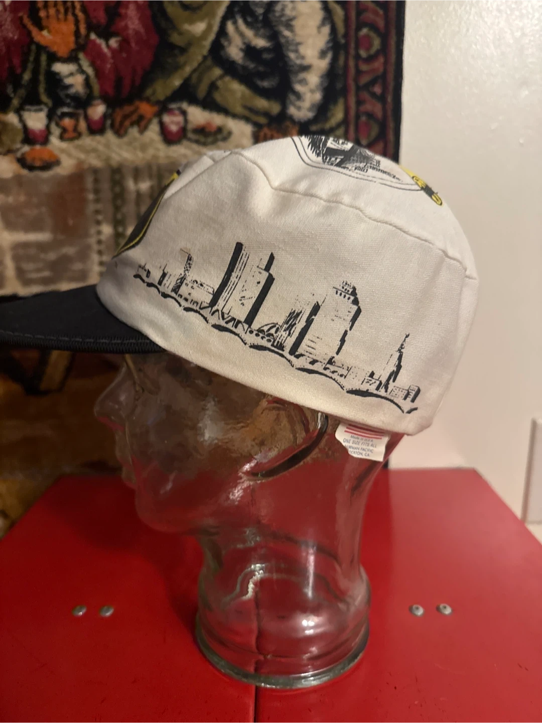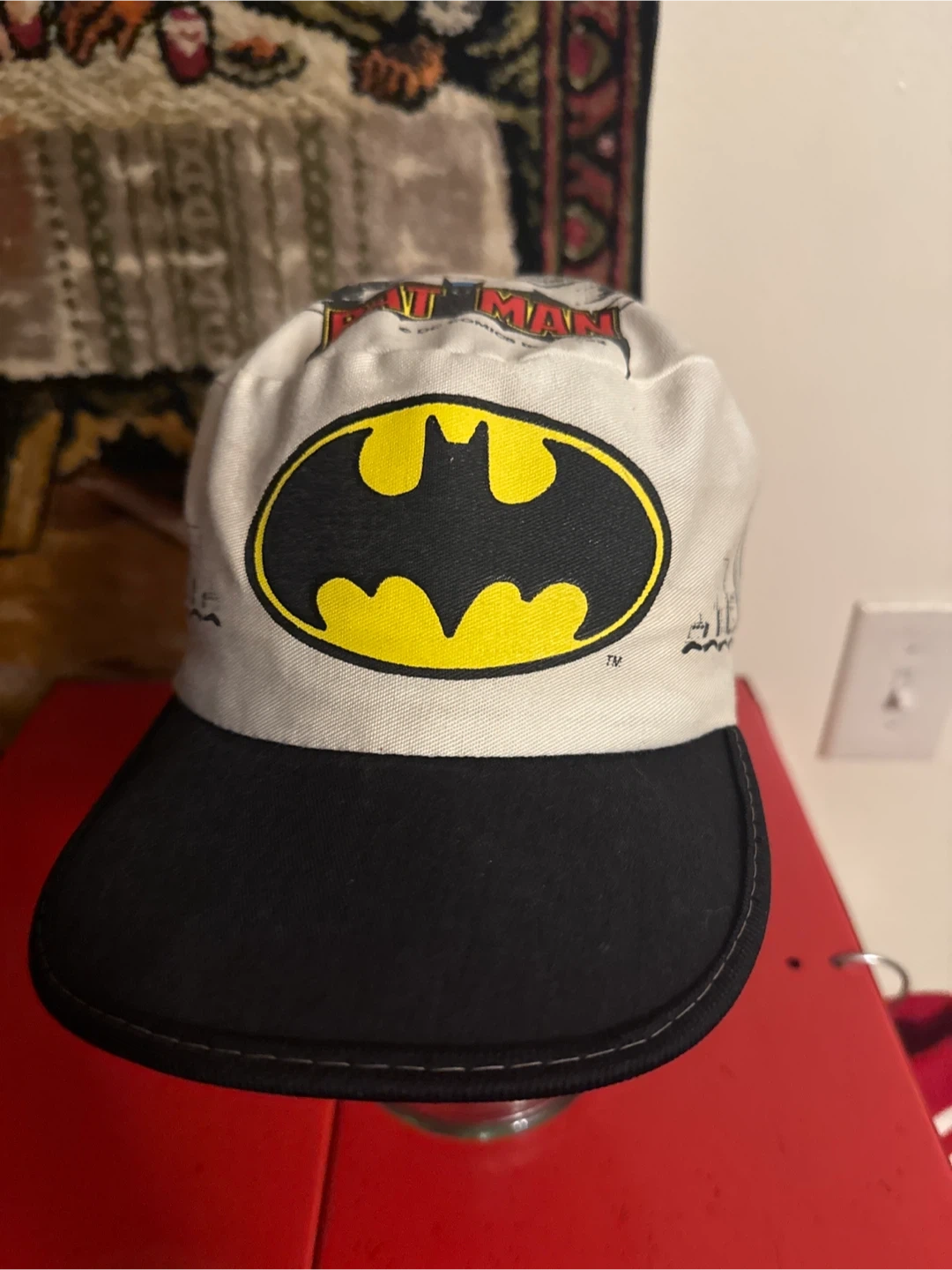 This is a vintage Batman baseball cap featuring the iconic character and cityscape graphics. It's a one-size-fits-all design. Great for any Batman fan!