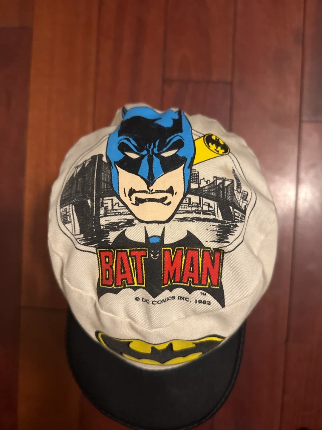 This is a vintage Batman baseball cap featuring the iconic character and cityscape graphics. It's a one-size-fits-all design. Great for any Batman fan!