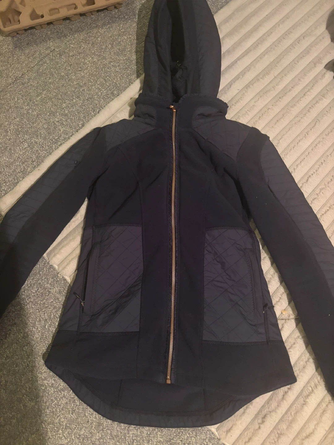 These were released quite a few years ago and sold out really fast.. It’s basically two jackets in one… as you can take the middle part out and the hood and just wear the fleece.. this one is a navy blue with rose gold zipper. Of only worn it maybe 4 to 5 times… it’s like new condition! Very flattering fit. Retailed for $198plus tax. It’s the perfect jacket for layering, especially in these brutal cold months.. also a great jacket for the spring or fall!!