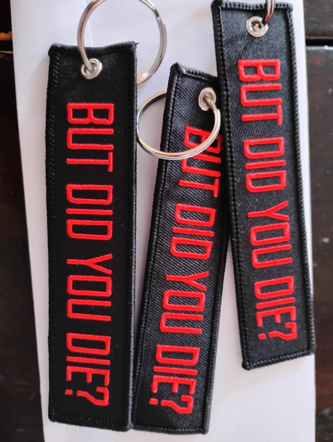 Set of three black fabric keychain with "But Did You Die?" embroidered in red. These are jet tags with a keyring attachment. They're durable and great for motorcycles or car keys! $5 each