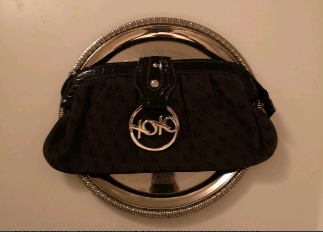 Metal XOXO clasp. Fabric clutch around, embossed with XOXO logo. Inside zipper pocket. Button clasp closure. leather trimming.