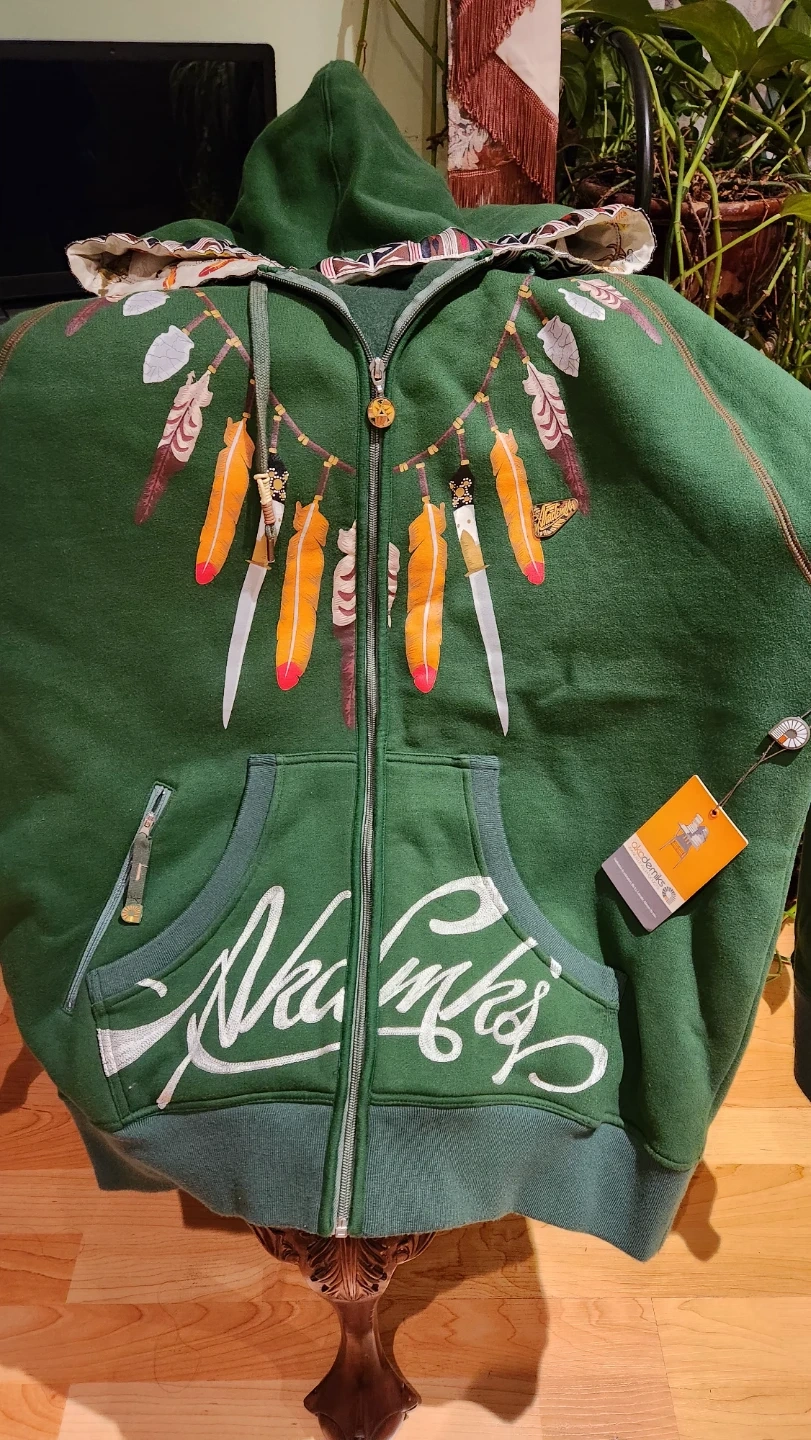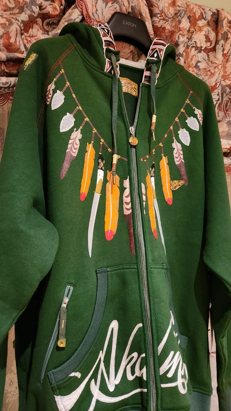 This green zip-up hoodie is from Akademiks brand and features a unique indigenous graph. It's a comfortable and stylish piece for casual wear. Made with a soft fabric blend.