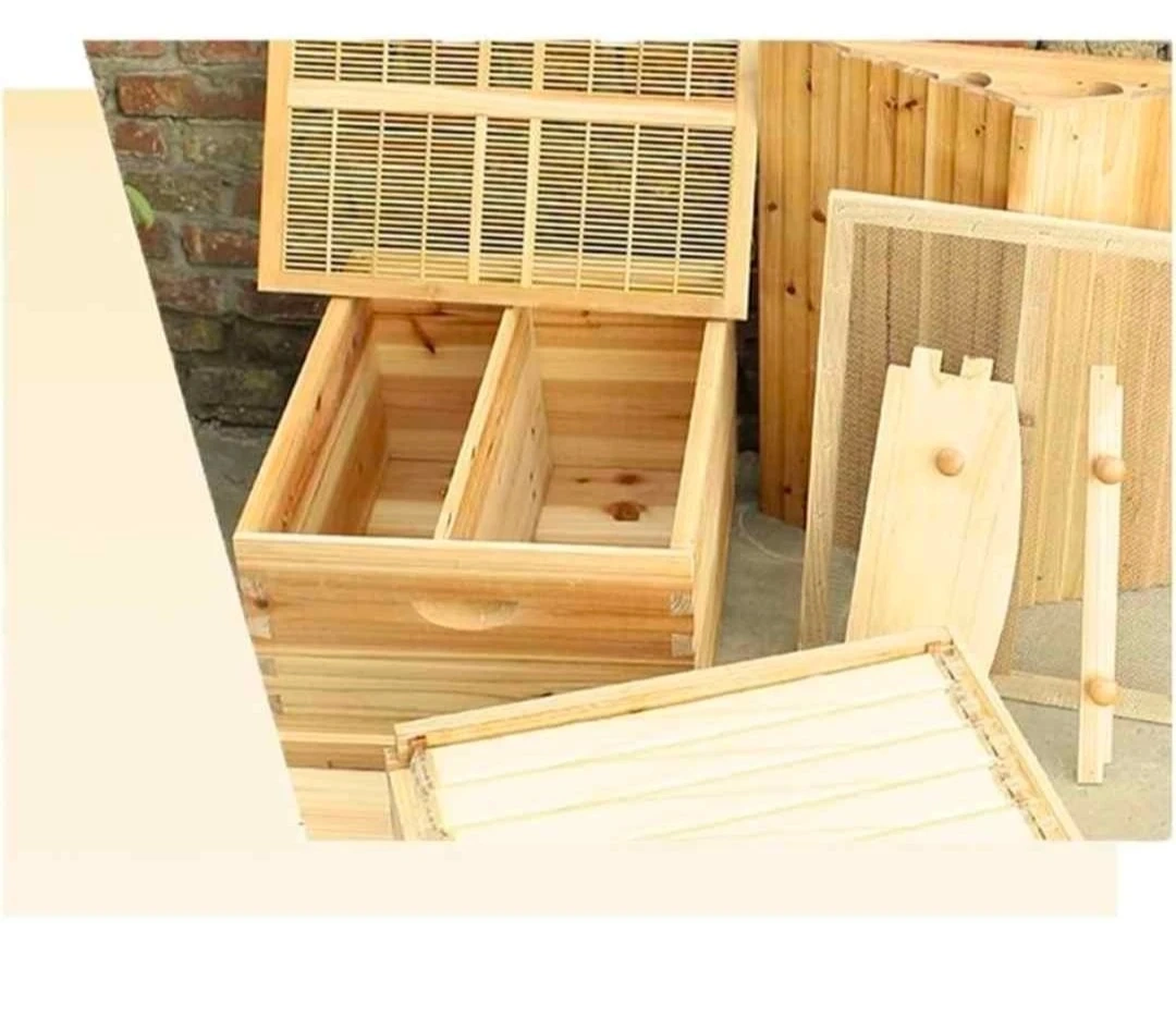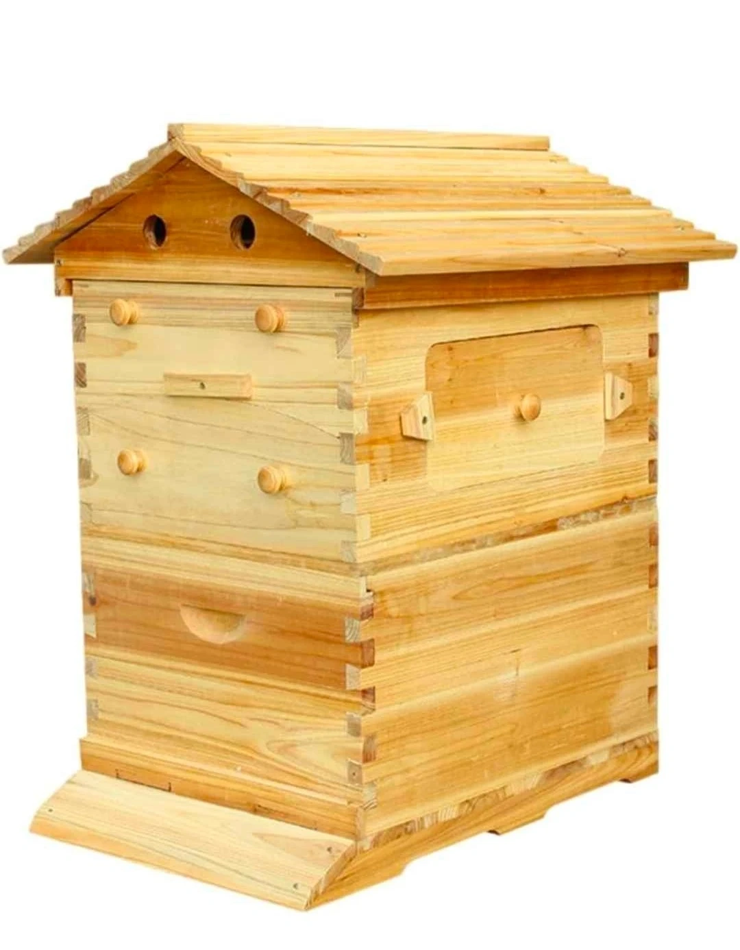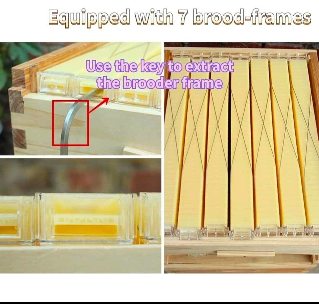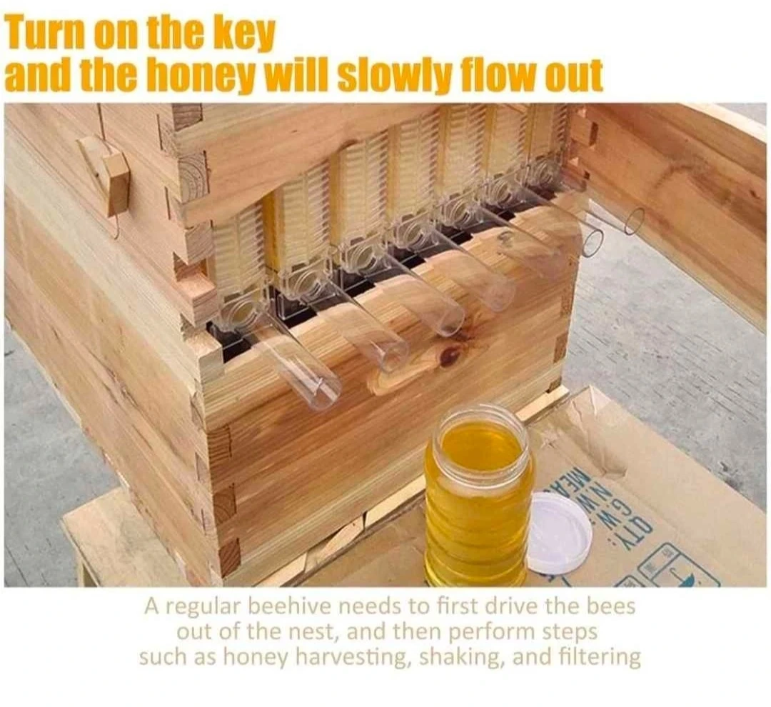 This wooden flow hive beehive is equipped with 7 super frames. Its innovative design allows for easy honey extraction by simply turning a key, without disturbing the bees. It's a great setup for beekeepers looking for a more efficient honey harvest!