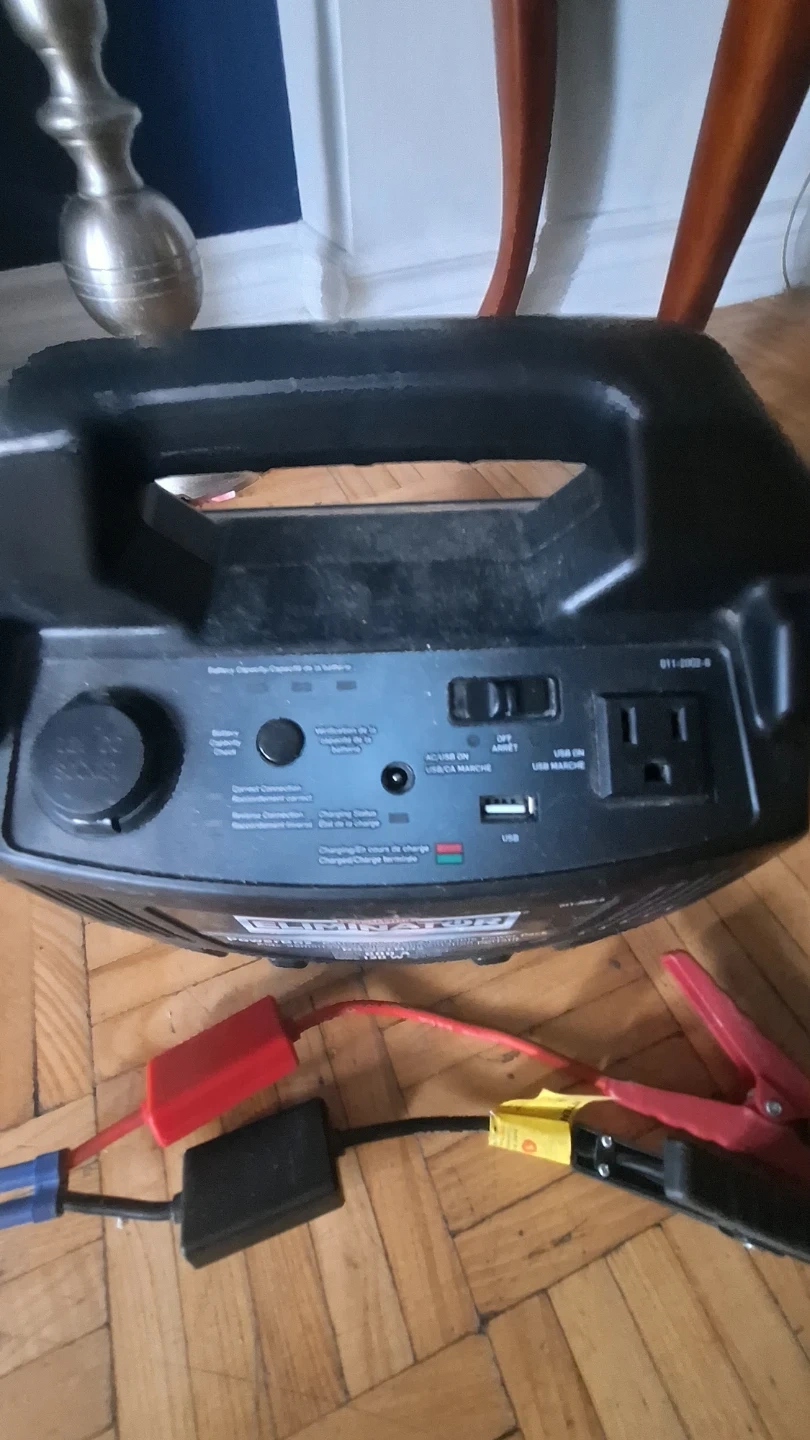 This Eliminator PowerBox 1200 is a portable jump starter. It's black and comes with jumper cables. This unit has USB ports and a power outlet.