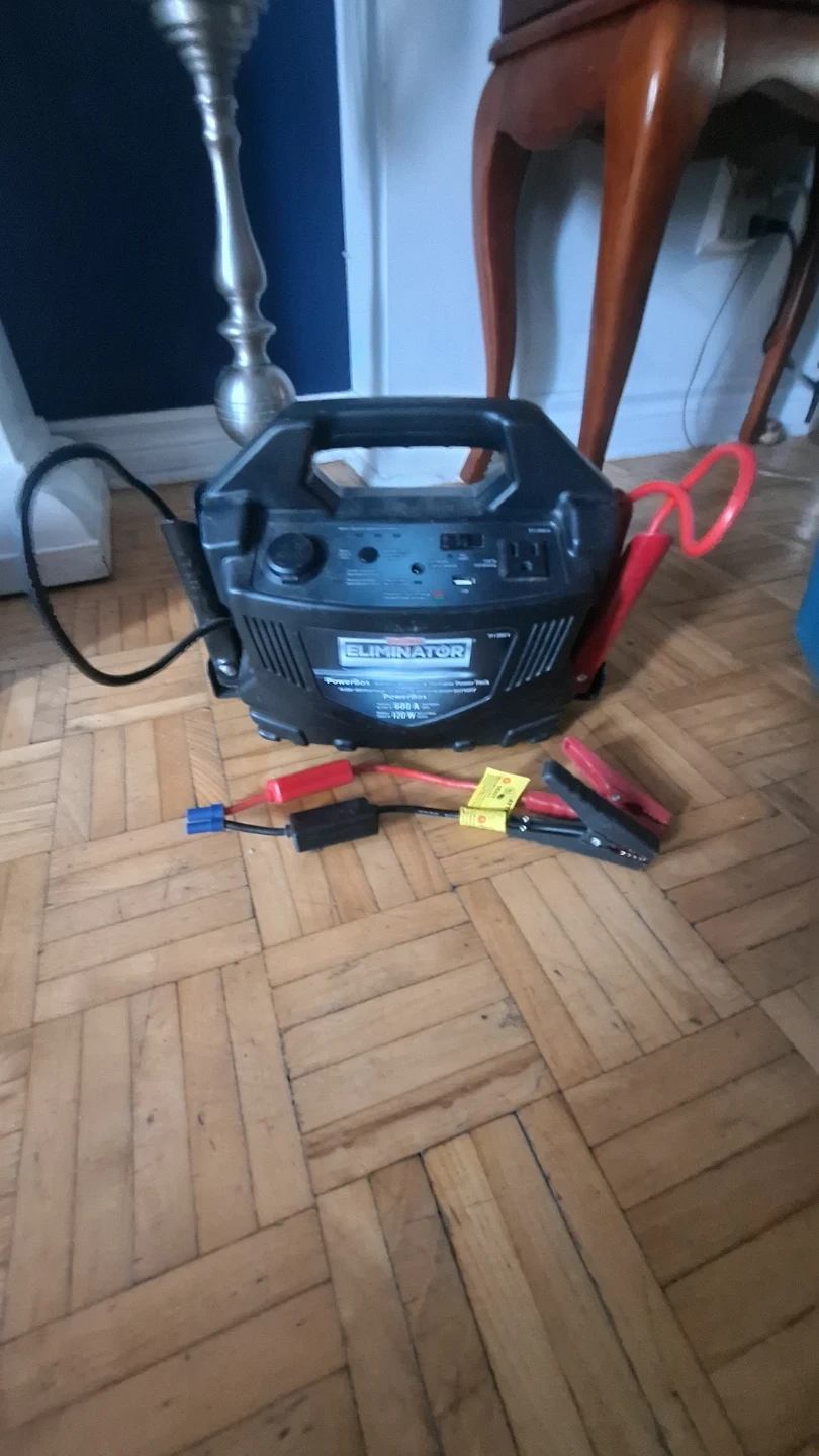 This Eliminator PowerBox 1200 is a portable jump starter. It's black and comes with jumper cables. This unit has USB ports and a power outlet.