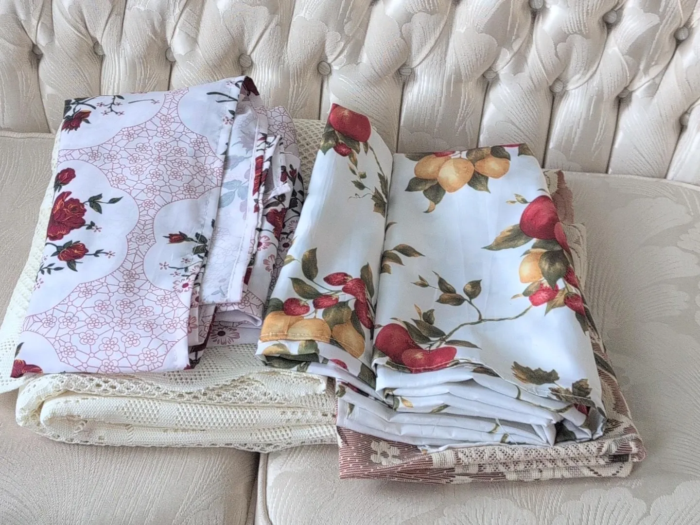Two lovely tablecloths, one with a red rose and intricate pink pattern, the other with a cheerful fruit design. Cotton material. Perfect for adding a touch of charm to your dining table!