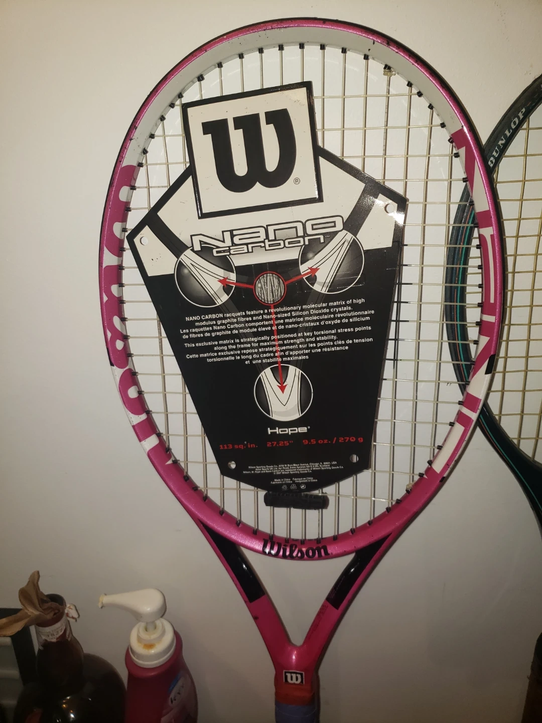 Selling a collection of four used tennis rackets. Includes two Wilson rackets, one with a pink frame and another with an orange and black accent. Also includes one Dunlop racket and one other branded racket. Great for recreational play or for someone starting out!