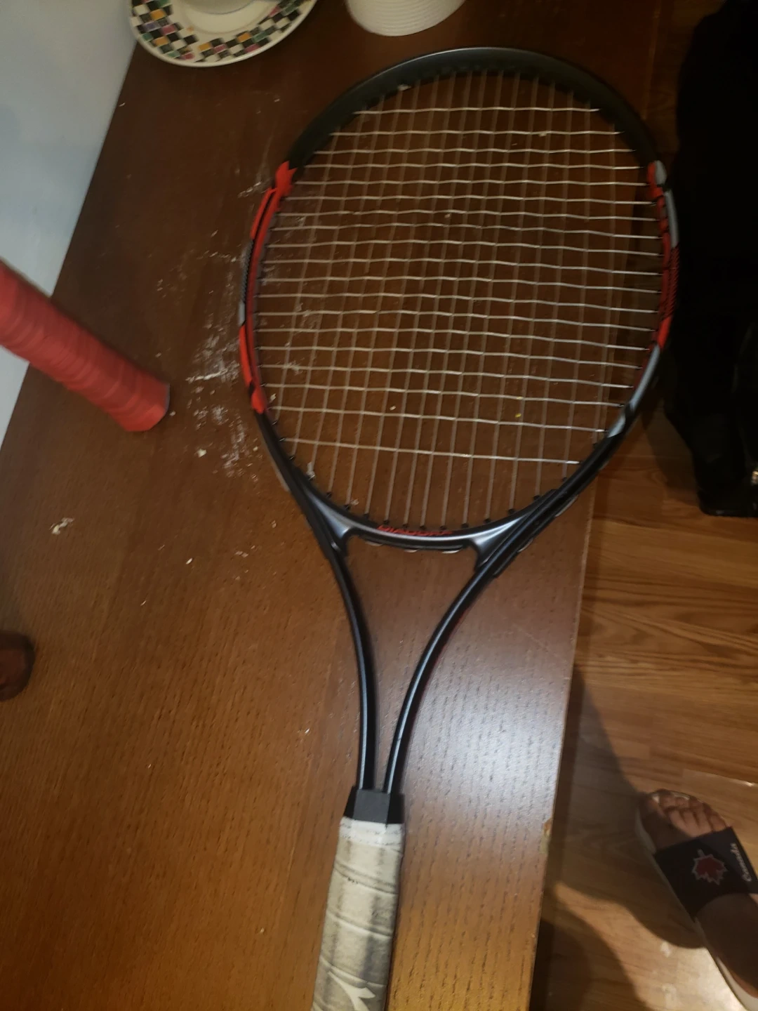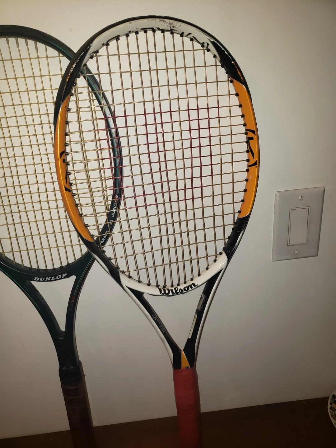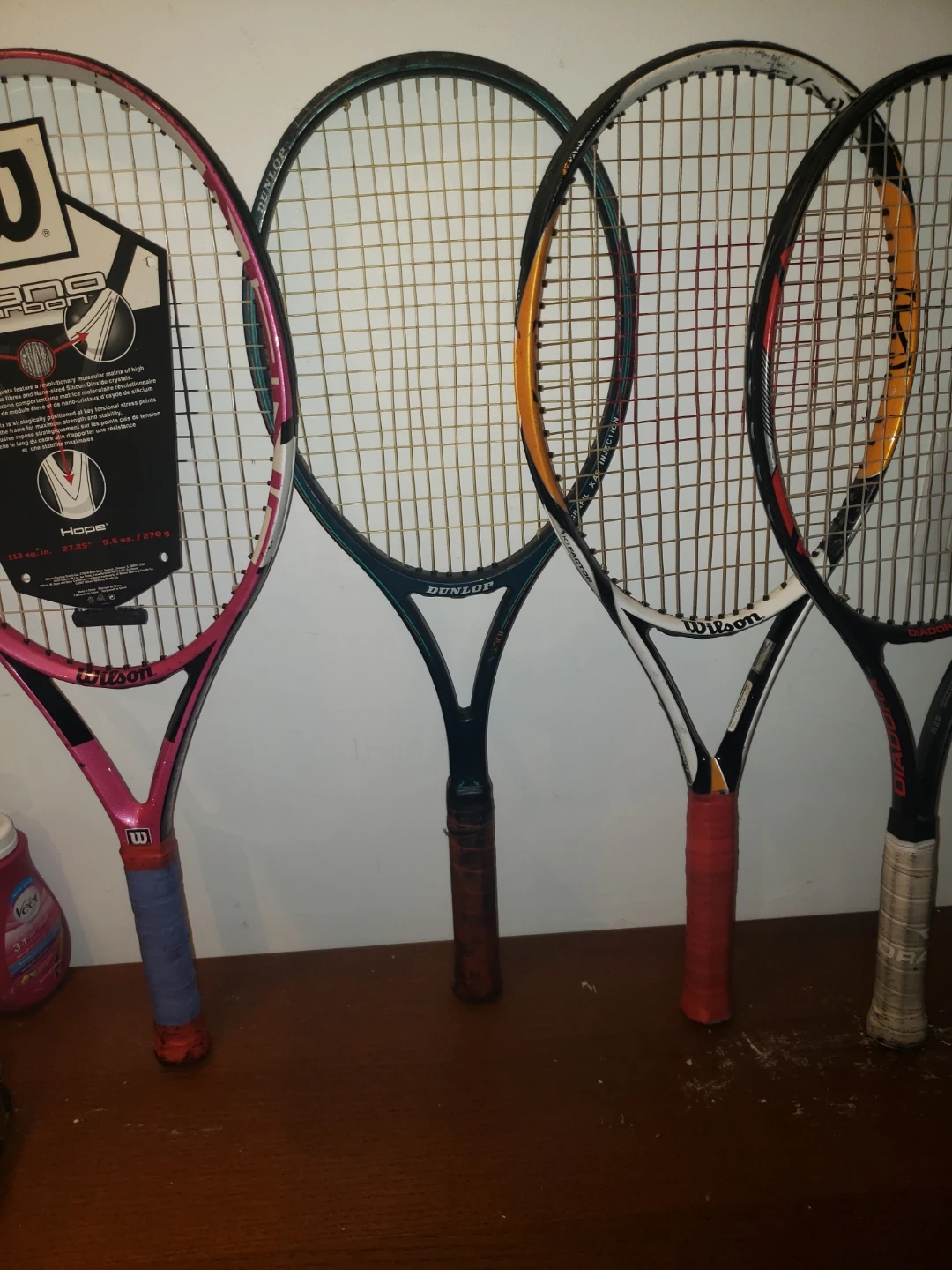 Selling a collection of four used tennis rackets. Includes two Wilson rackets, one with a pink frame and another with an orange and black accent. Also includes one Dunlop racket and one other branded racket. Great for recreational play or for someone starting out!