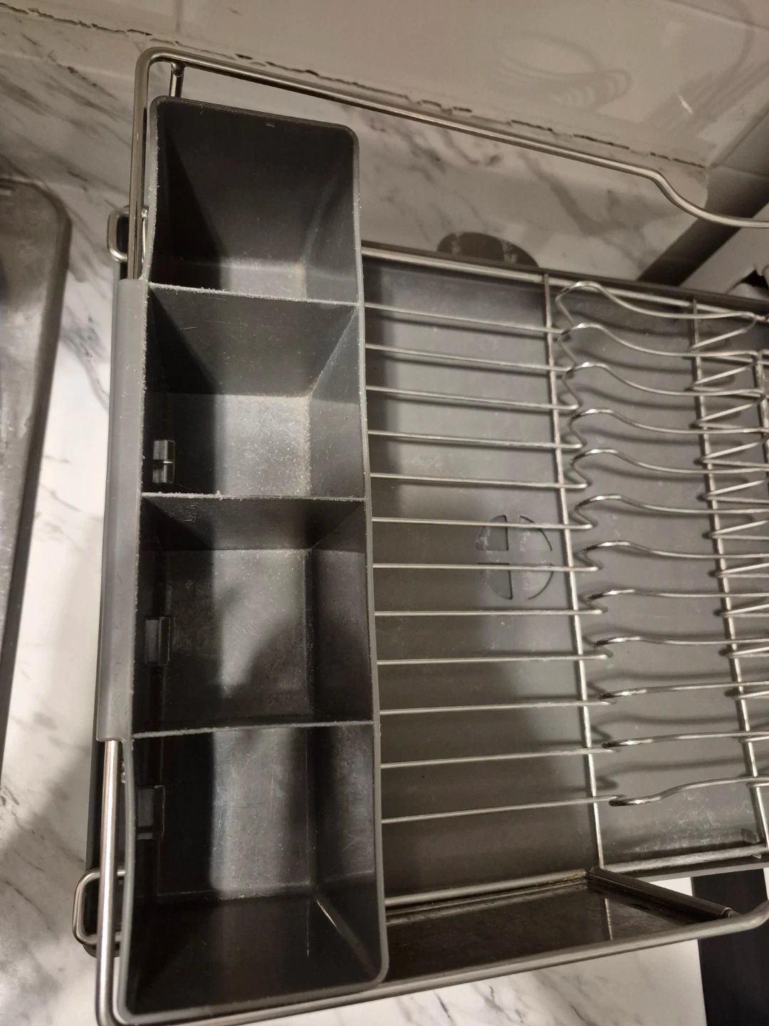This dish drying rack is made of durable metal with a grey plastic cutlery holder. It has multiple slots to hold plates and cups, plus sections for organizing silverware.