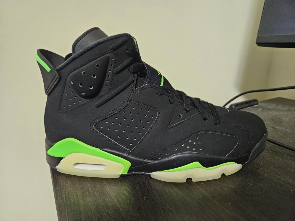 Black and neon green Air Jordan 6 Retro sneakers. Comes with original box. A classic silhouette with a vibrant colourway.