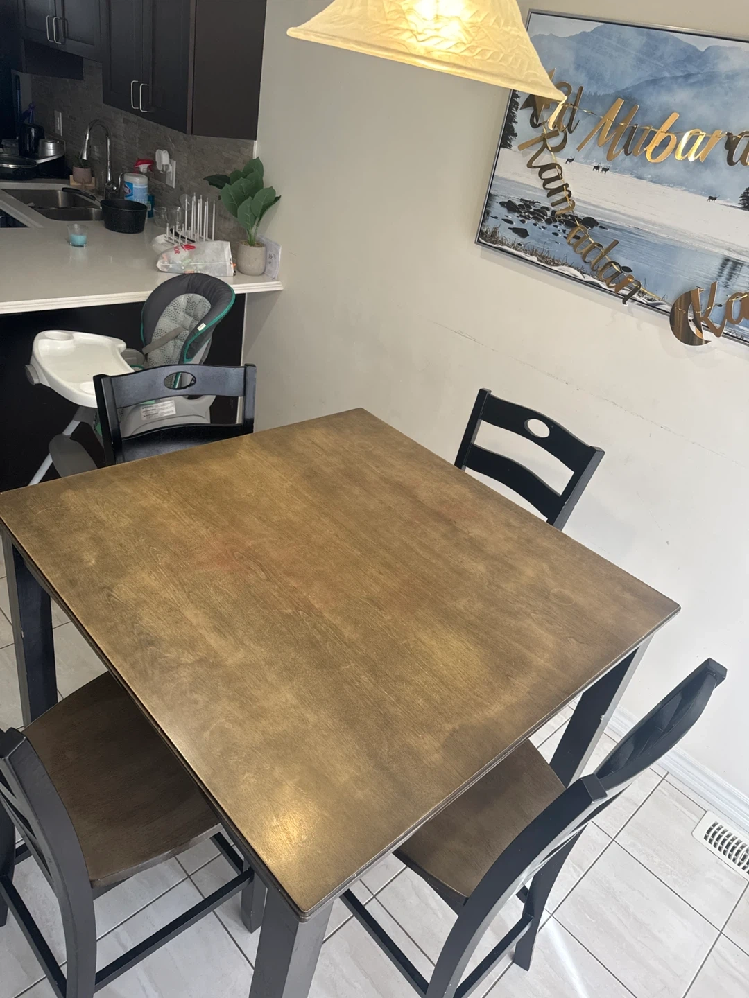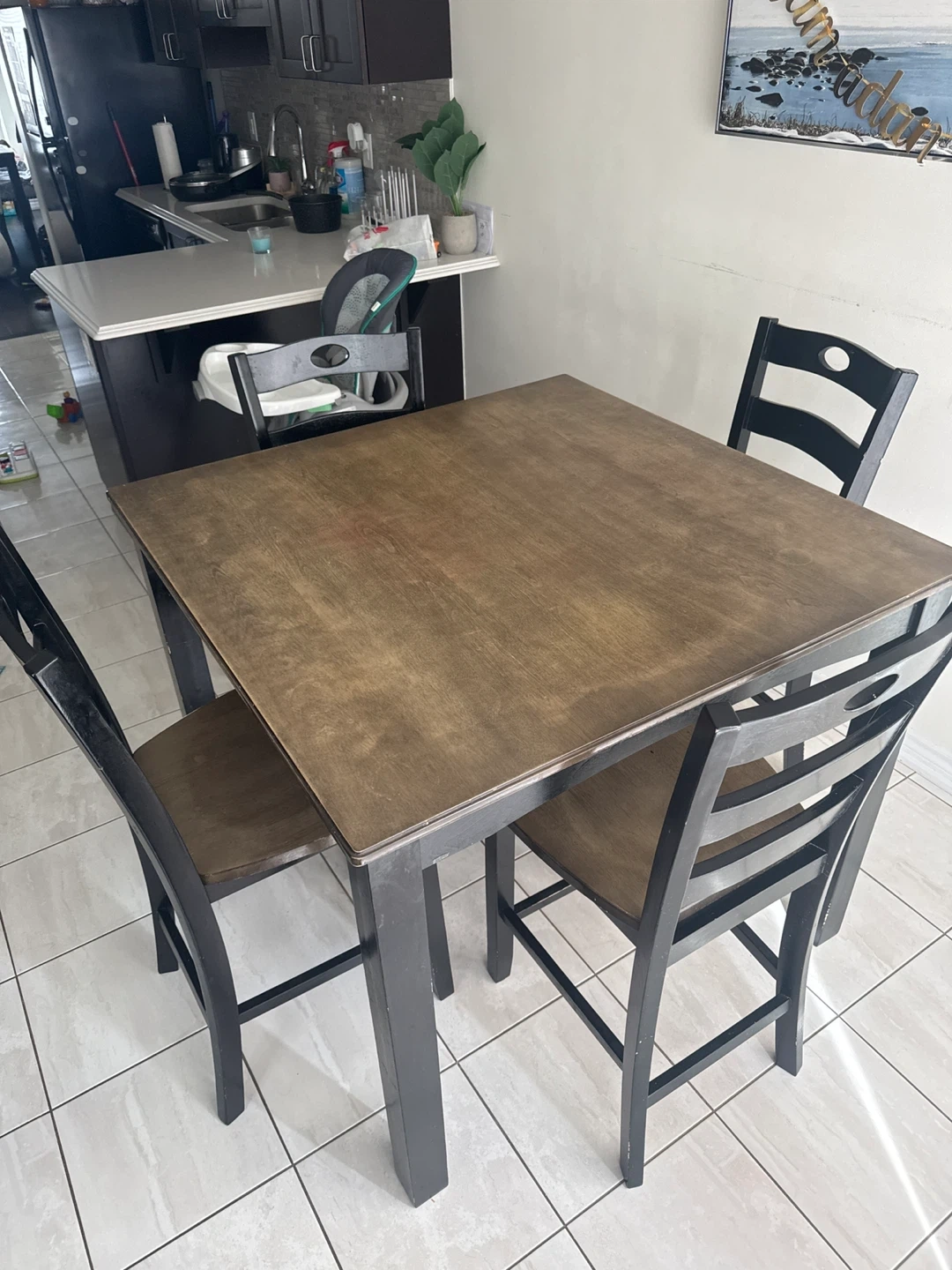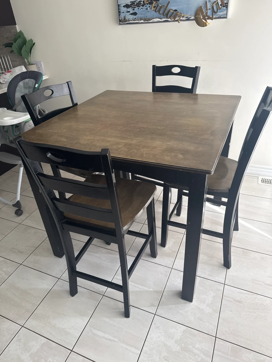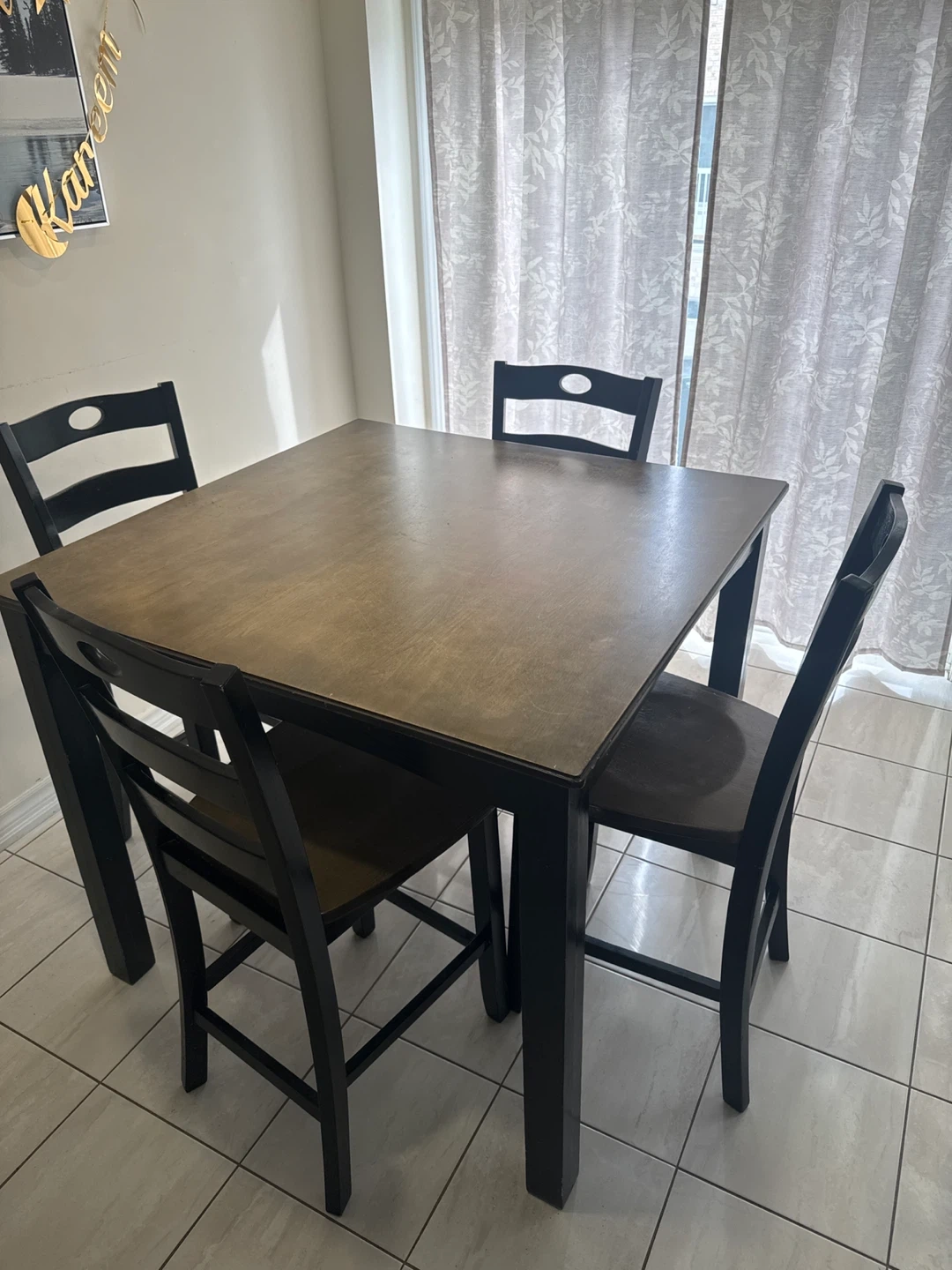 This is a 5 piece dining set. It includes one table and four chairs. The table has a wooden top with a dark base. The chairs are also dark with wooden seats and backs.