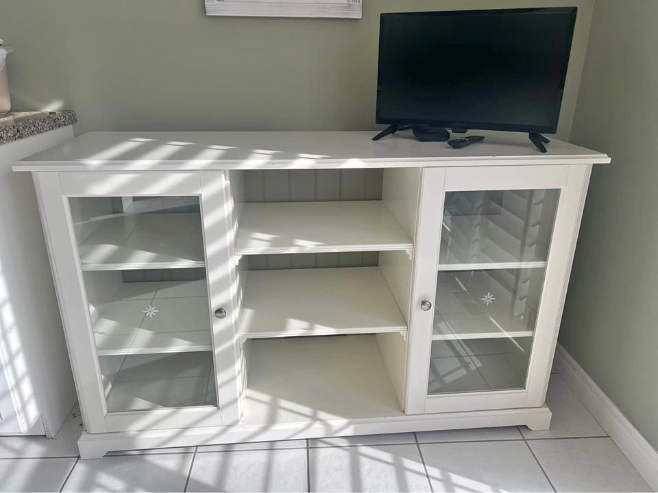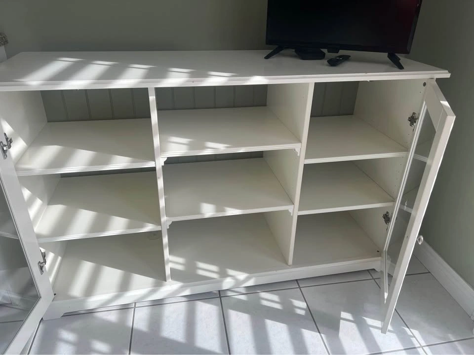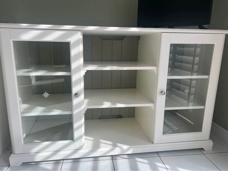 White sideboard would complement any kitchen or house decor. Features 2 glass doors with a design feature. Approximate measurements: 50 cm deep x 145 cm long x 85 cm high.