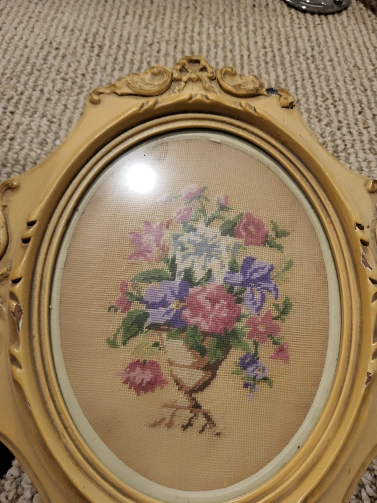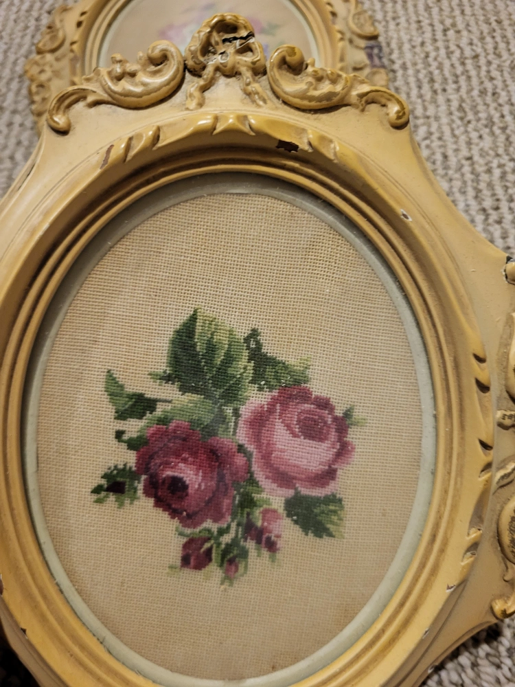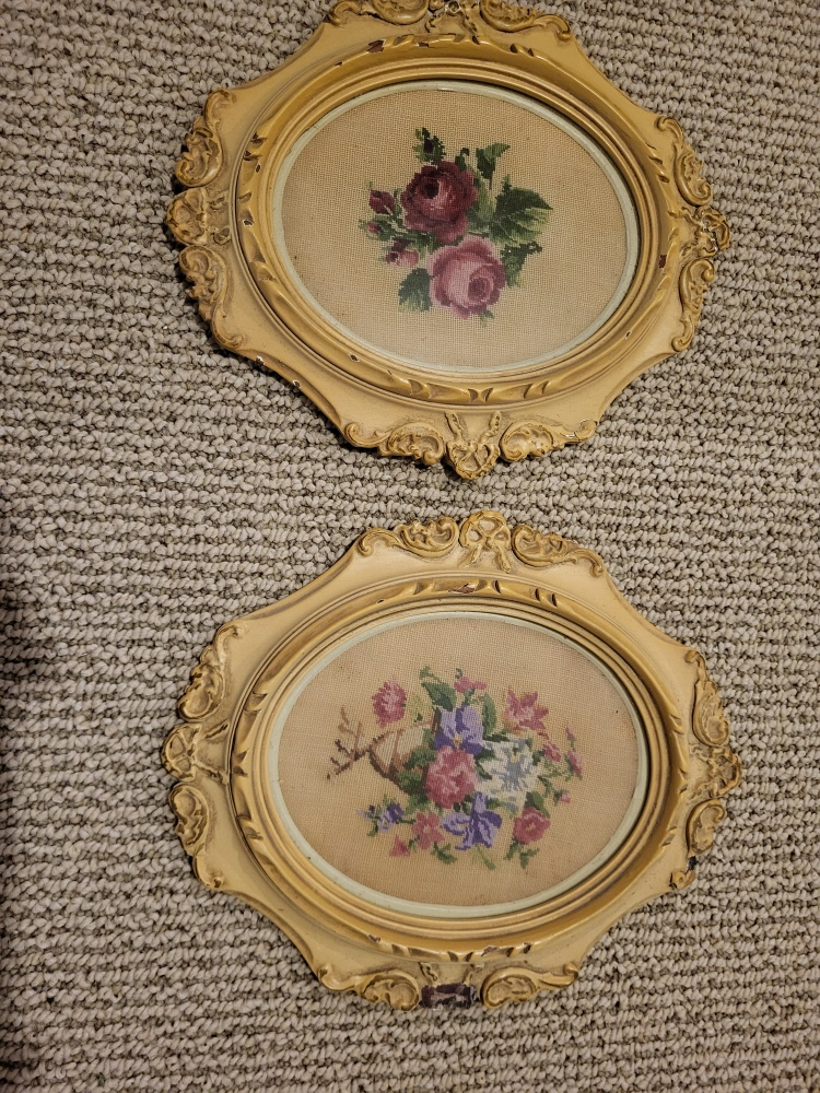 Two antique framed needlepoint pictures. Original frames, some damage. Floral designs. Perfect for vintage or cottage decor.