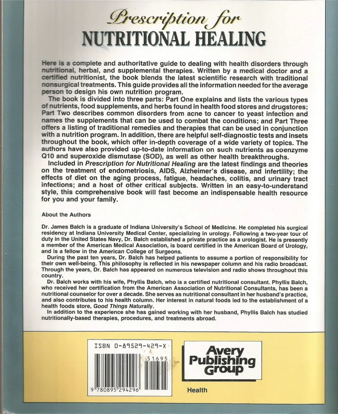 Selling a copy of 'Prescription for Nutritional Healing' by James F. Balch, M.D. and Phyllis A. Balch, C.N.C. It's a comprehensive guide and practical A-Z reference to drug-free remedies using vitamins, minerals, herbs, and food supplements.