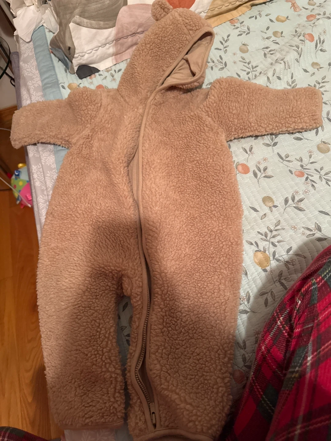 Only worn once, this is like new. Cozy and warm fuzzy teddy bear hooded bunting suit. It features a full zip front for easy dressing and cute bear ears on the hood. Made from soft sherpa fleece material.