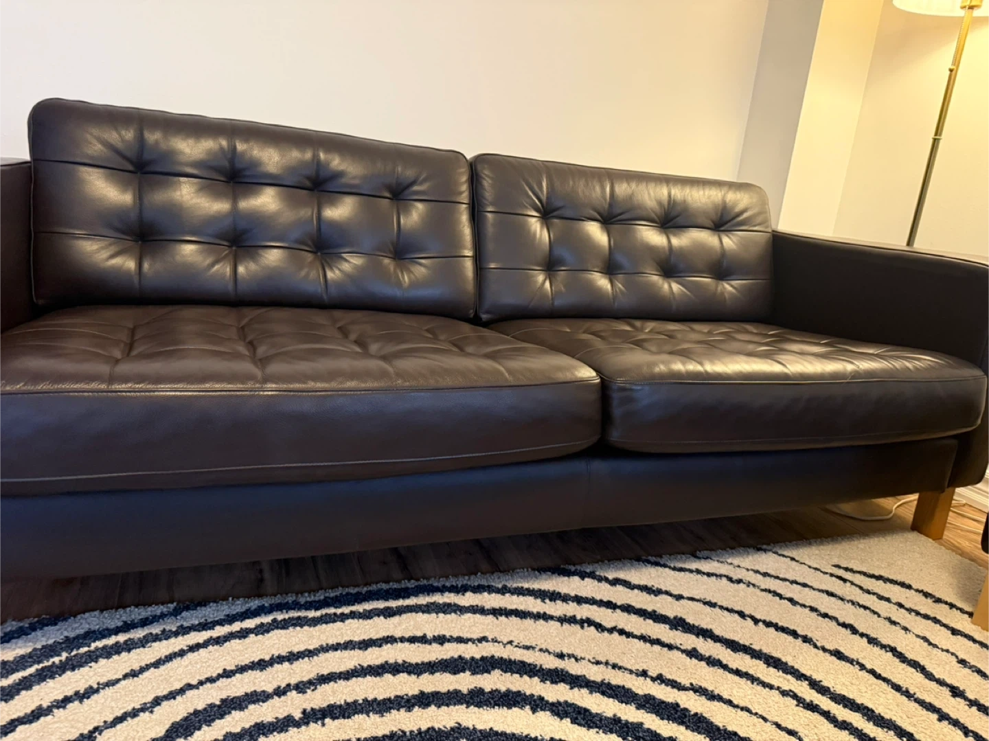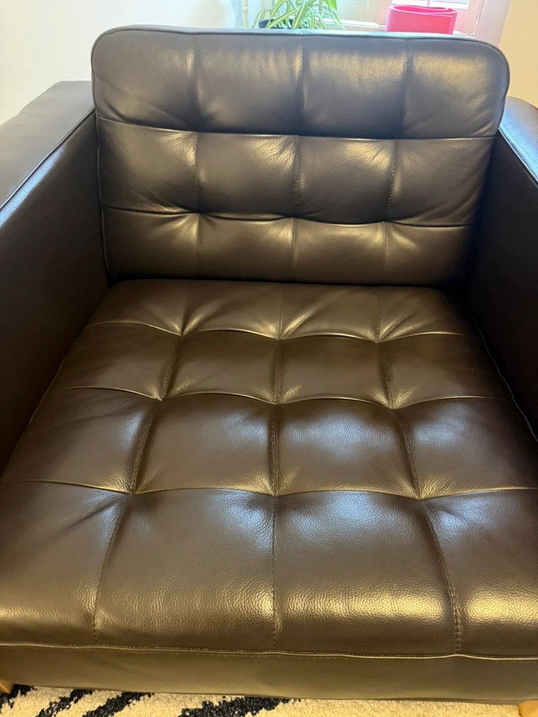 A dark brown tufted leather sofa set, including chair and ottoman with wooden legs.