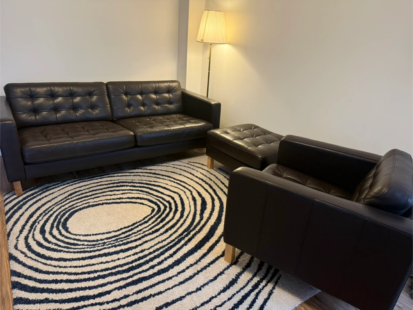A dark brown tufted leather sofa set, including chair and ottoman with wooden legs.