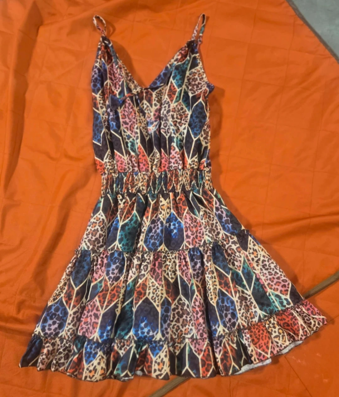 This is a CBR women's summer dress with a colourful animal print. It features a smocked waist and a tiered, ruffled hemline. Perfect for a casual day out!