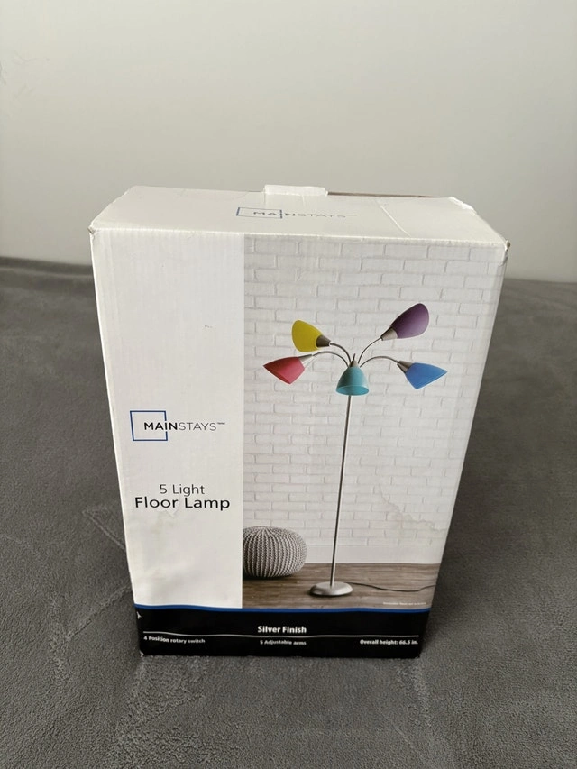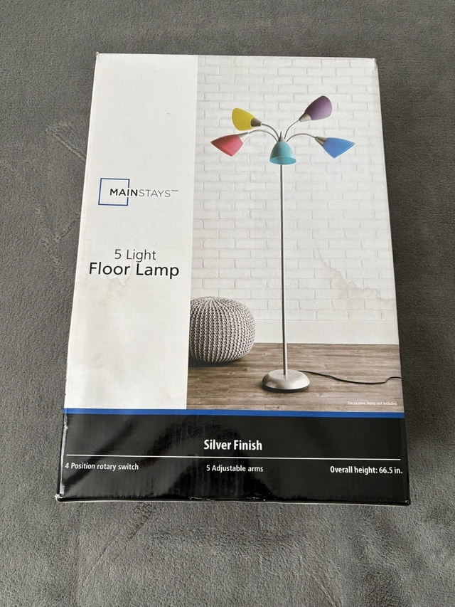 Mainstays 5 Light Floor Lamp. Height is 65.5 inches. 4 position rotary switch. Uses type A bulb, 5 x 40 watts (not included). Brand New. For sale by owner. Pick up in Pickering. Cash accepted.