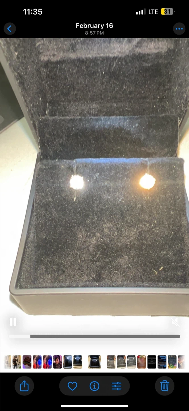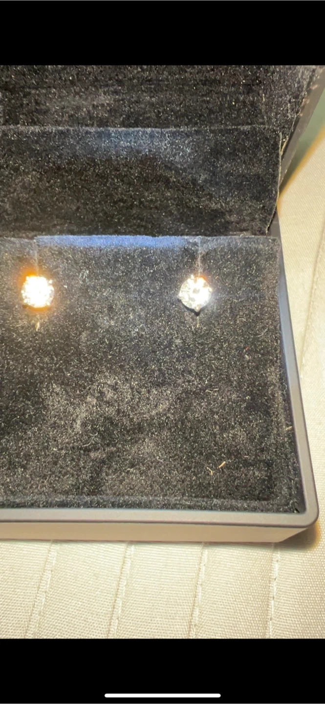 Pair of sparkling diamond stud earrings. These earrings come in a black velvet-lined presentation box, ready for gifting or safekeeping. The diamonds appear to be a substantial size.