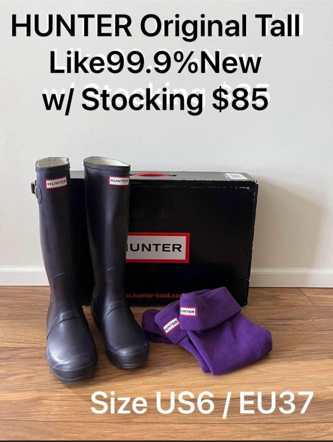 HUNTER Original Tall boots in black. Includes boot socks and original box. Size US 8/EU 39.and US6/EU39.