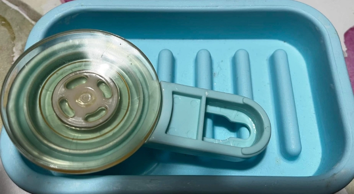 Soap dish. Features a suction cup and a light blue plastic tray. Perfect for a bathroom or kitchen.