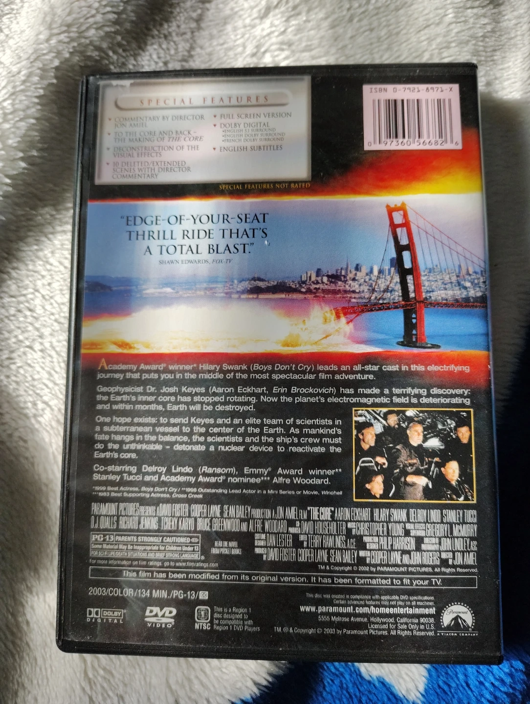 This is the full screen edition of the movie The Core. It includes special features like director's commentary and visual effects breakdowns. A thrilling sci-fi adventure flick!