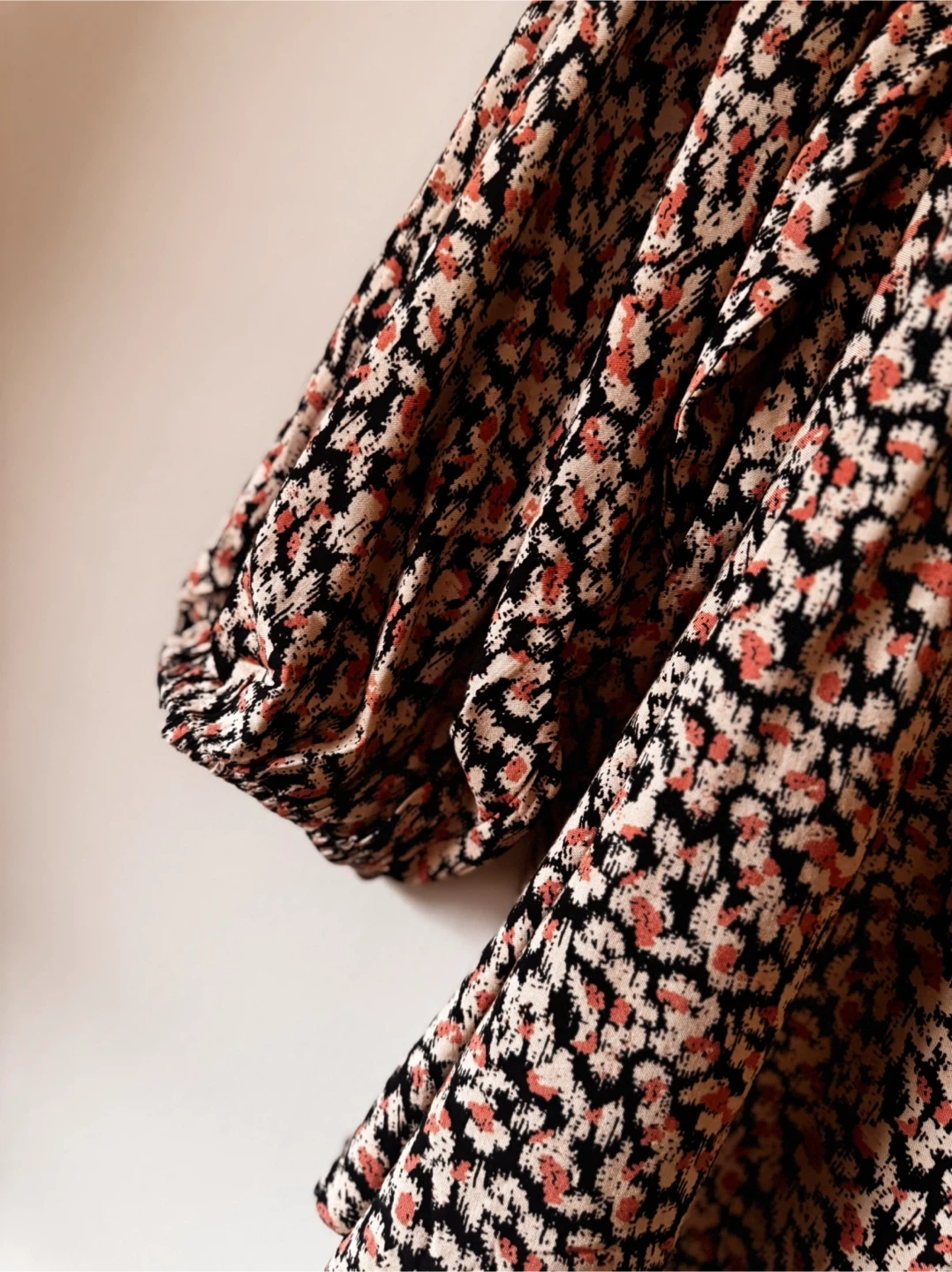 Cute long sleeve blouse with a floral print. It has a v-neck and balloon sleeves. Perfect for a casual or dressy look!