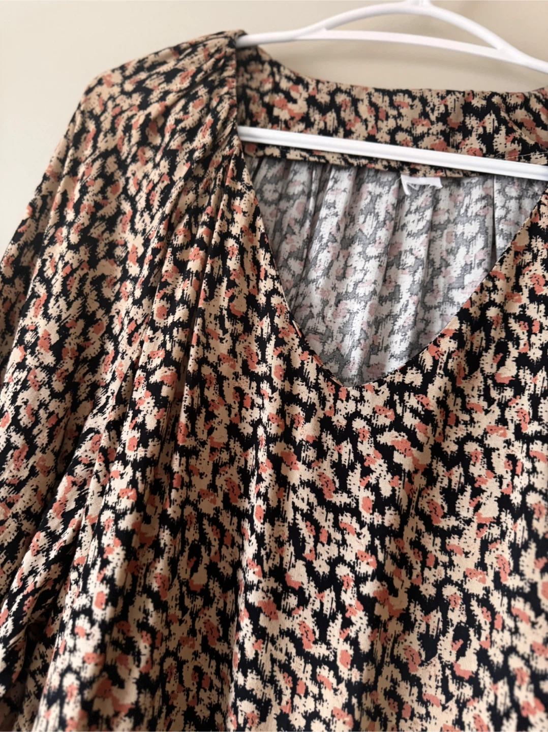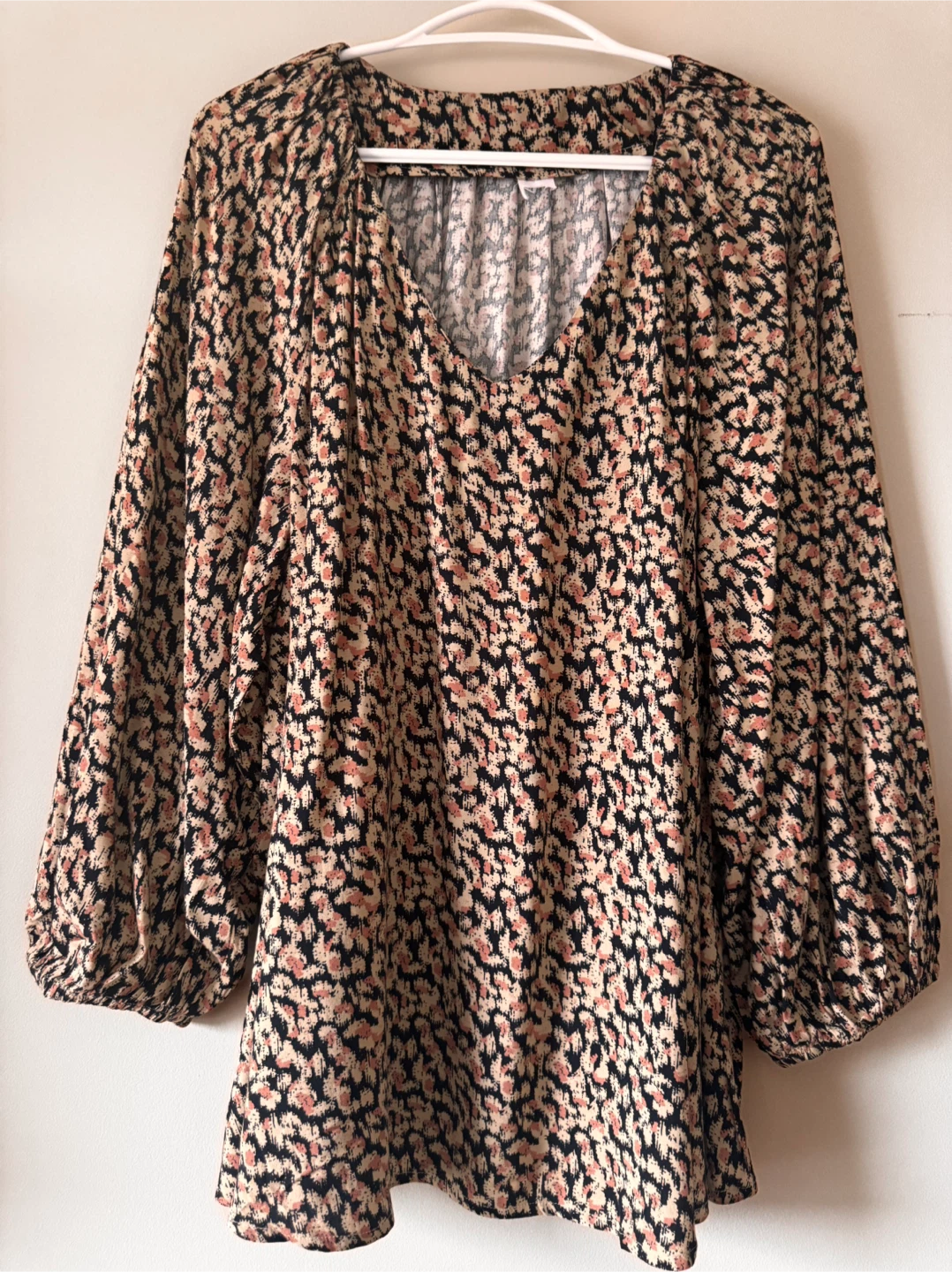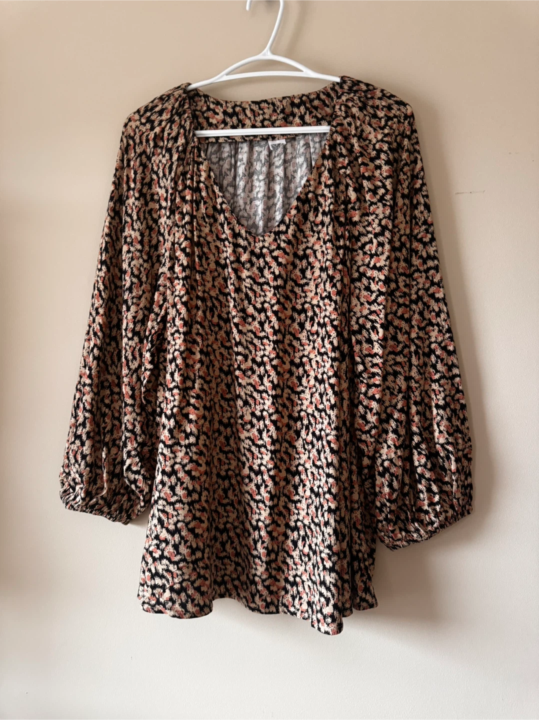 Cute long sleeve blouse with a floral print. It has a v-neck and balloon sleeves. Perfect for a casual or dressy look!