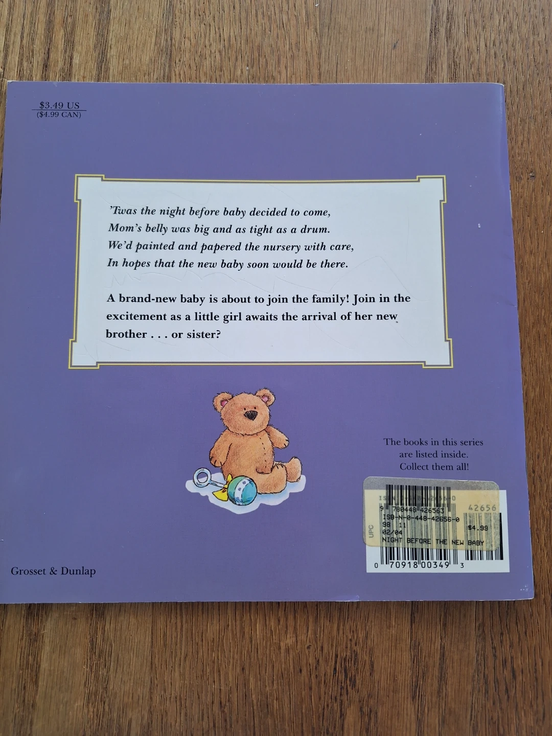 It's a children's book titled 'The Night Before the New Baby' by Natasha Wing, illustrated by Tammie Lyon. This book tells the story of a family preparing for a new sibling. It's great for kids anticipating a new brother or sister!